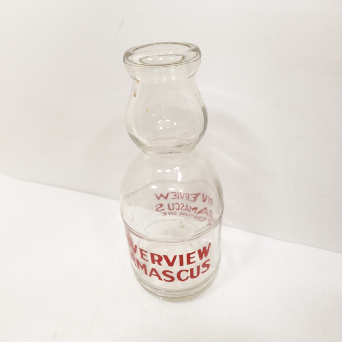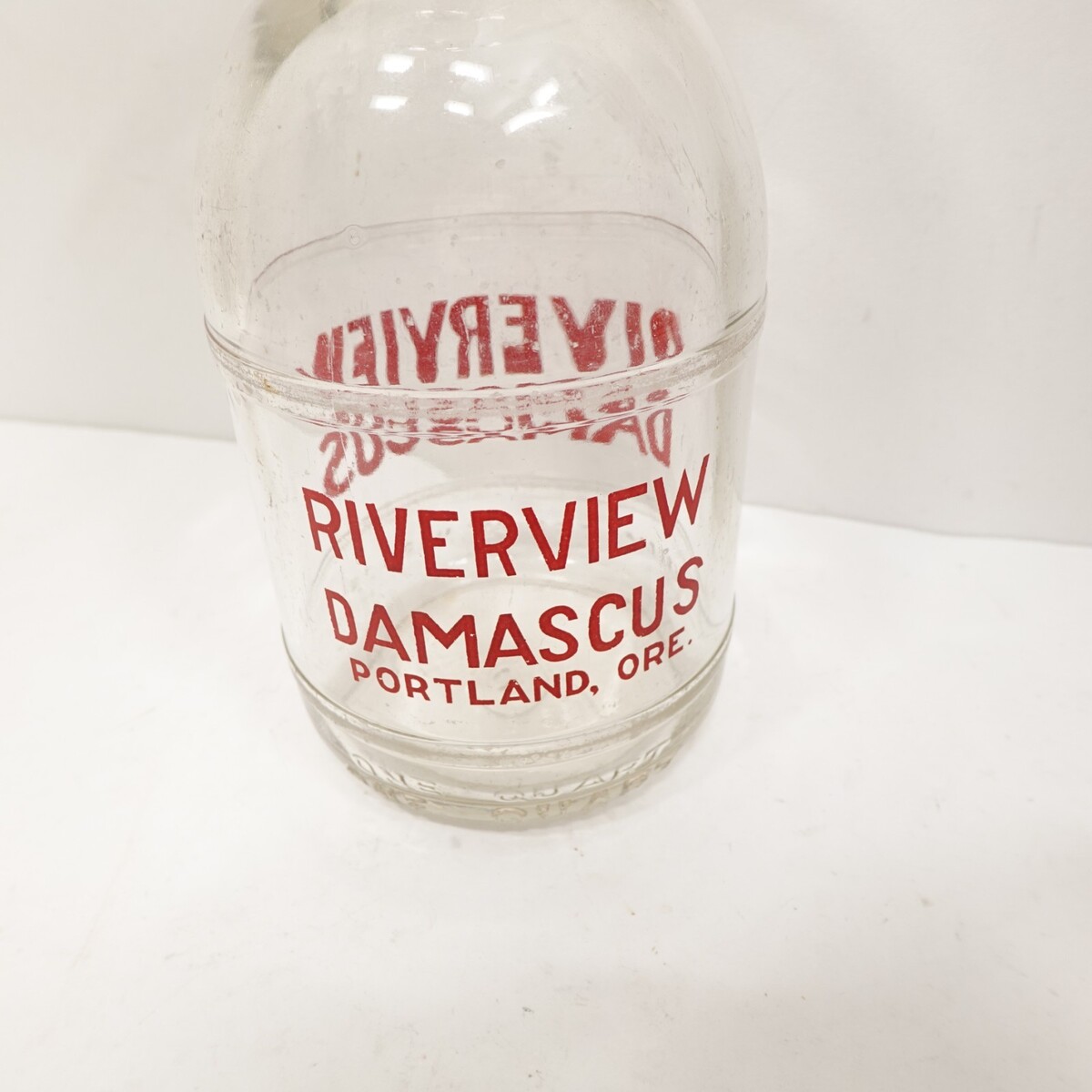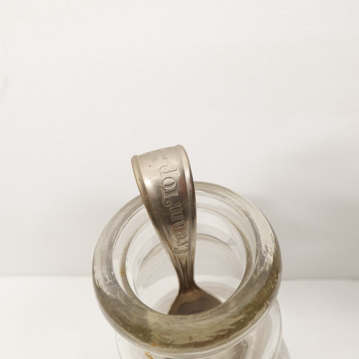 Vintage Riverview Damascus Portland, Oregon ?Cream Top? milk bottle with the original embossed metal cream spoon. The clear glass bottle features red lettering and the classic bulb-shaped cream separator top. The spoon is marked ?Cream Top? and fits neatly into the neck, used to separate the cream from the milk.