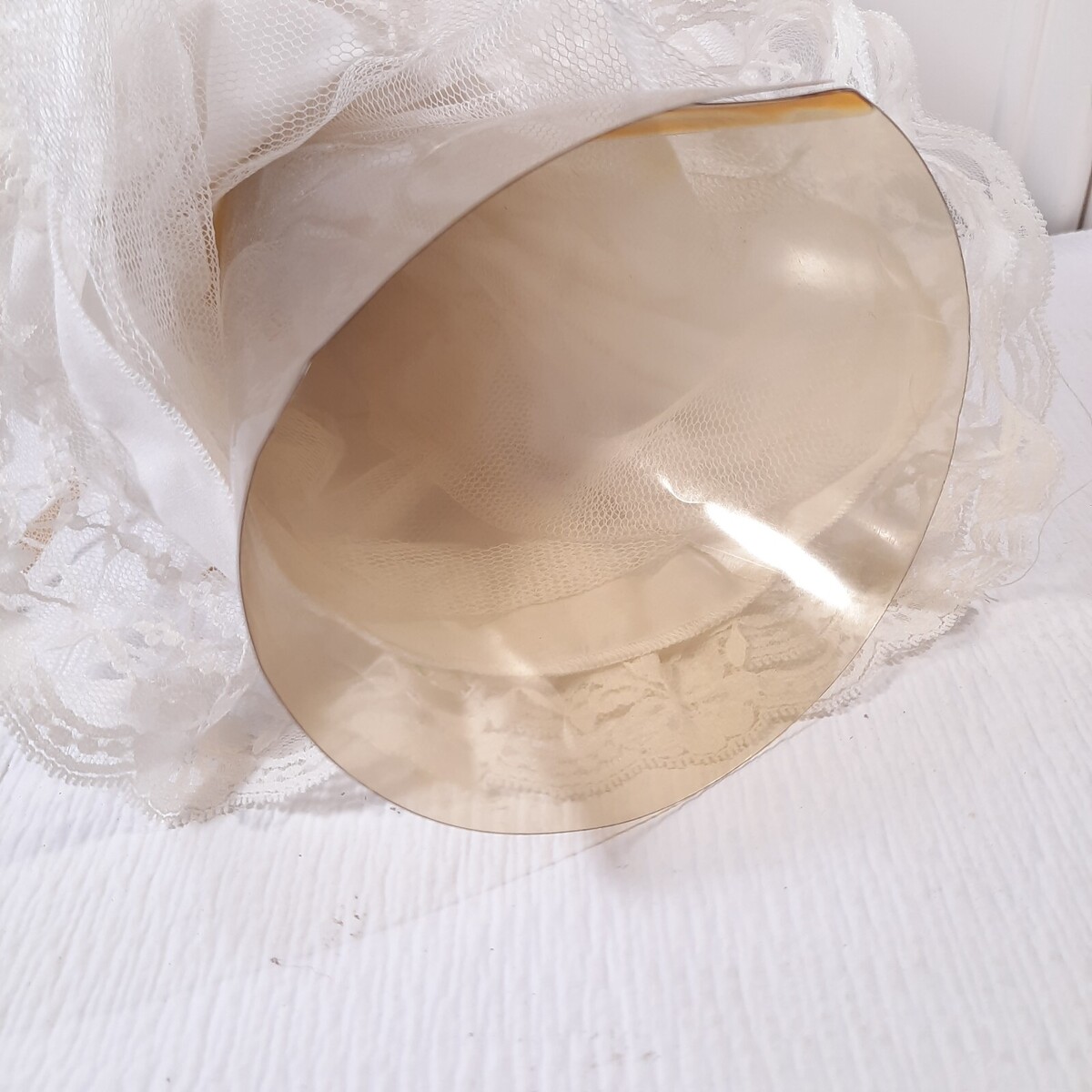 Inside cone is brittle and could use repair as it is cracked as shown. Exterior is in Very good condition. Minor wear from use. White with gold accents.