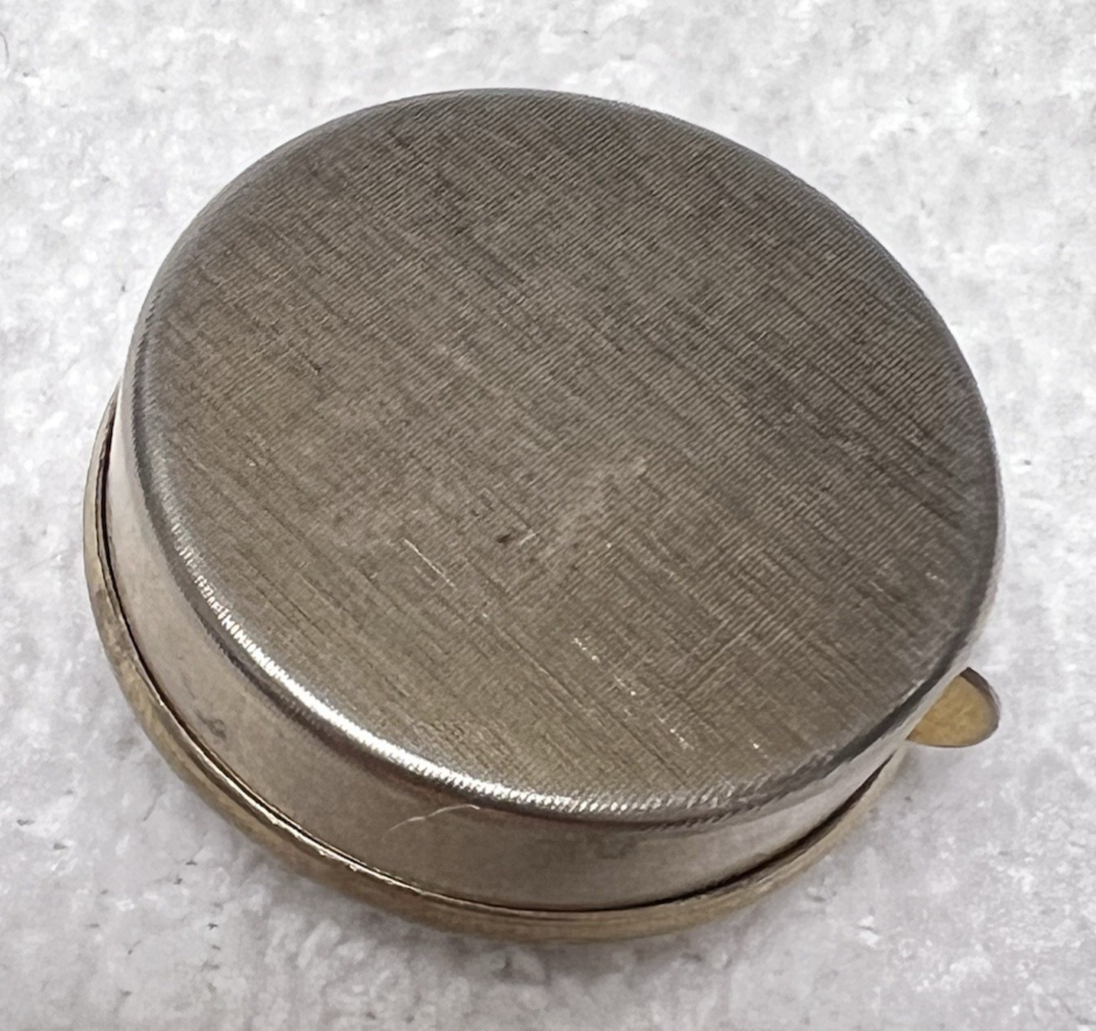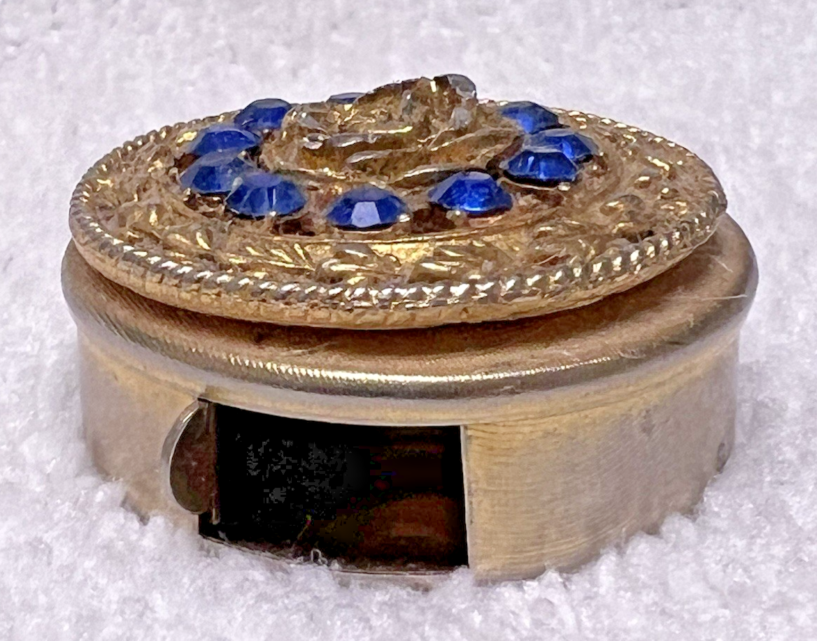 - Vintage Rose w Blue Rhinestone Round Pillbox Pill Box 1 1/2" Sliding Door !