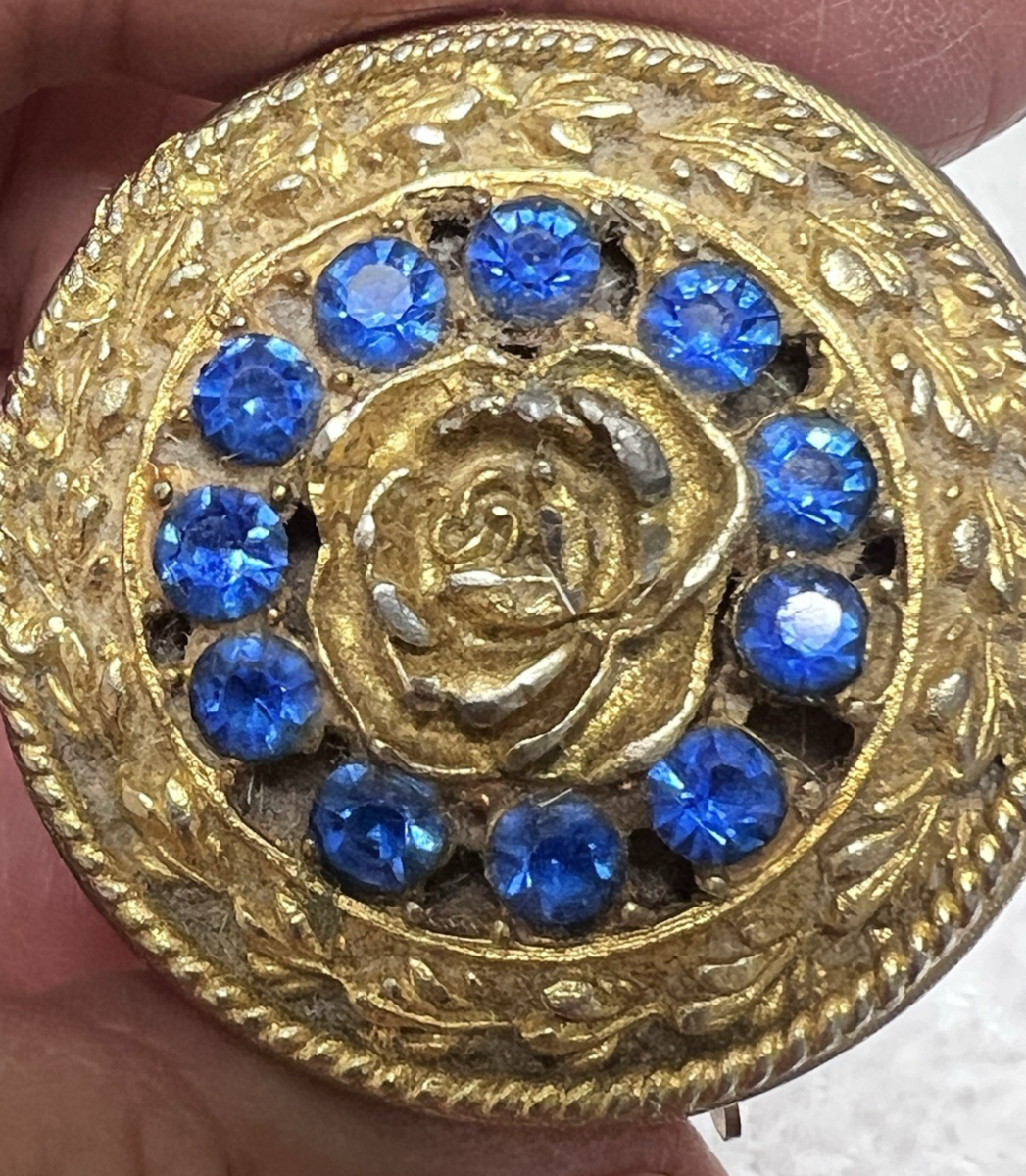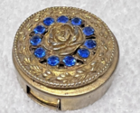 Vintage Rose w Blue Rhinestone Round Pillbox Pill Box 1 1/2" Sliding Door !