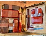 The vintage Rumpp leather vanity case is in very good shape- outside has some wear on the front, but inside is pretty pristine. I don't think any of the innards were ever used, toothbrush looks new, and nothing was ever in the soap holder. or aftershave bottle. Brushes look unused. Zipper works great. Measures roughly 10" x 7"x 2". it DOES have a monogram, I.C.S.