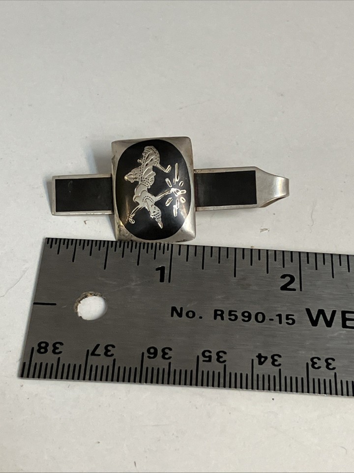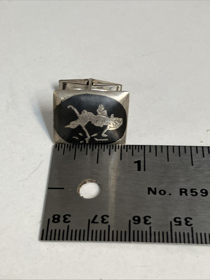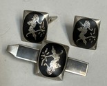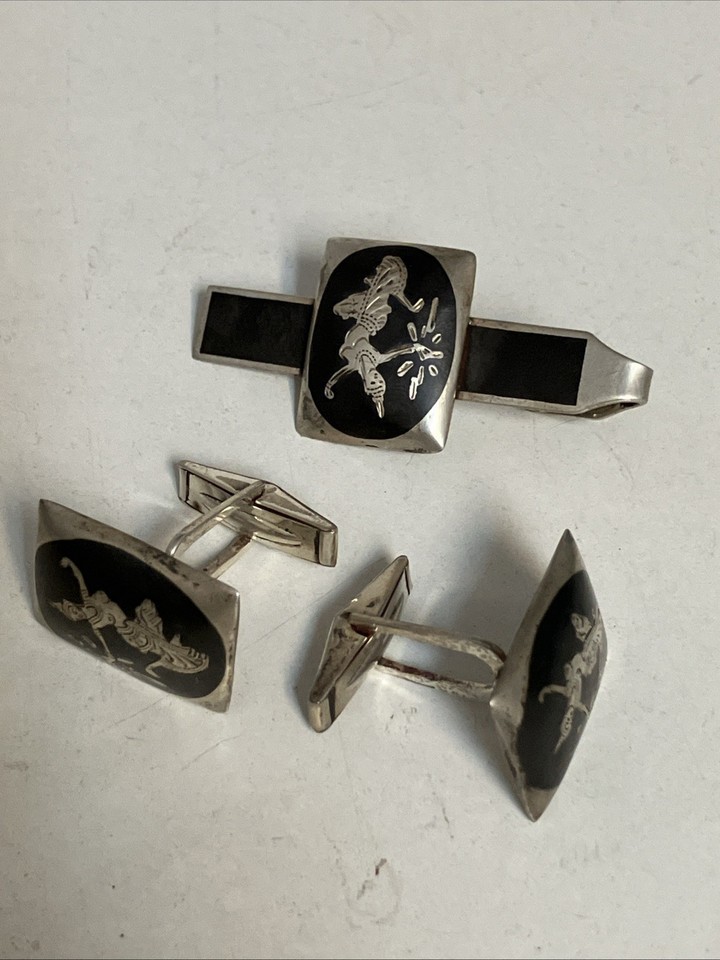 - Vintage SIAM Dancer Sterling Silver Niello Enamel 2” Tie Bar & Cuff Links set