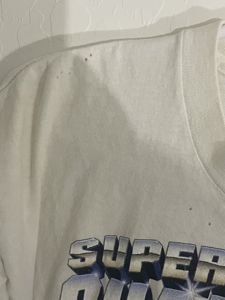 Shirt is structurally solid. No rips no holes. Shirt has light yellow discoloring duo to age