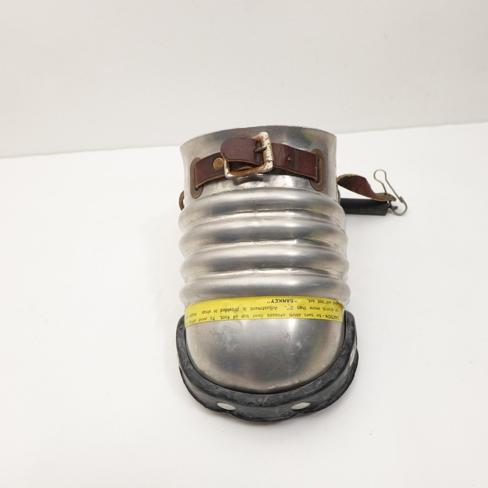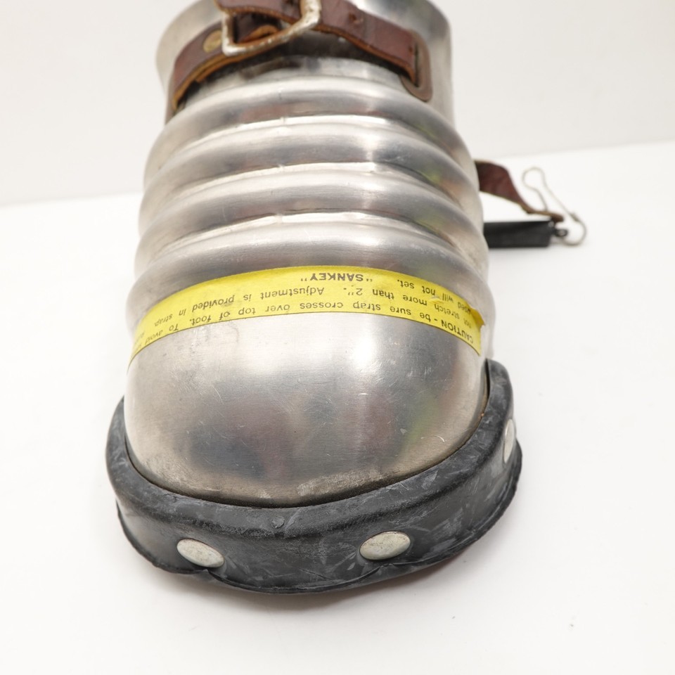 Vintage Sankey #5 aluminum leg/shin protector. Originally used by linemen, loggers, or utility workers for lower leg protection. Heavy-duty ribbed aluminum construction with original leather straps, spring-loaded toe strap, and rubber bumper. Marked ?SANKEY 5?.