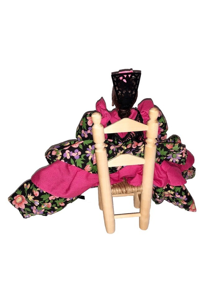Vintage Spanish Marin Chiclana Porcelain Dancer Doll FLAMENCO FLORAL Dress with Chair Seated Shelf Sitter Spanish Flamenco Dancer Spain