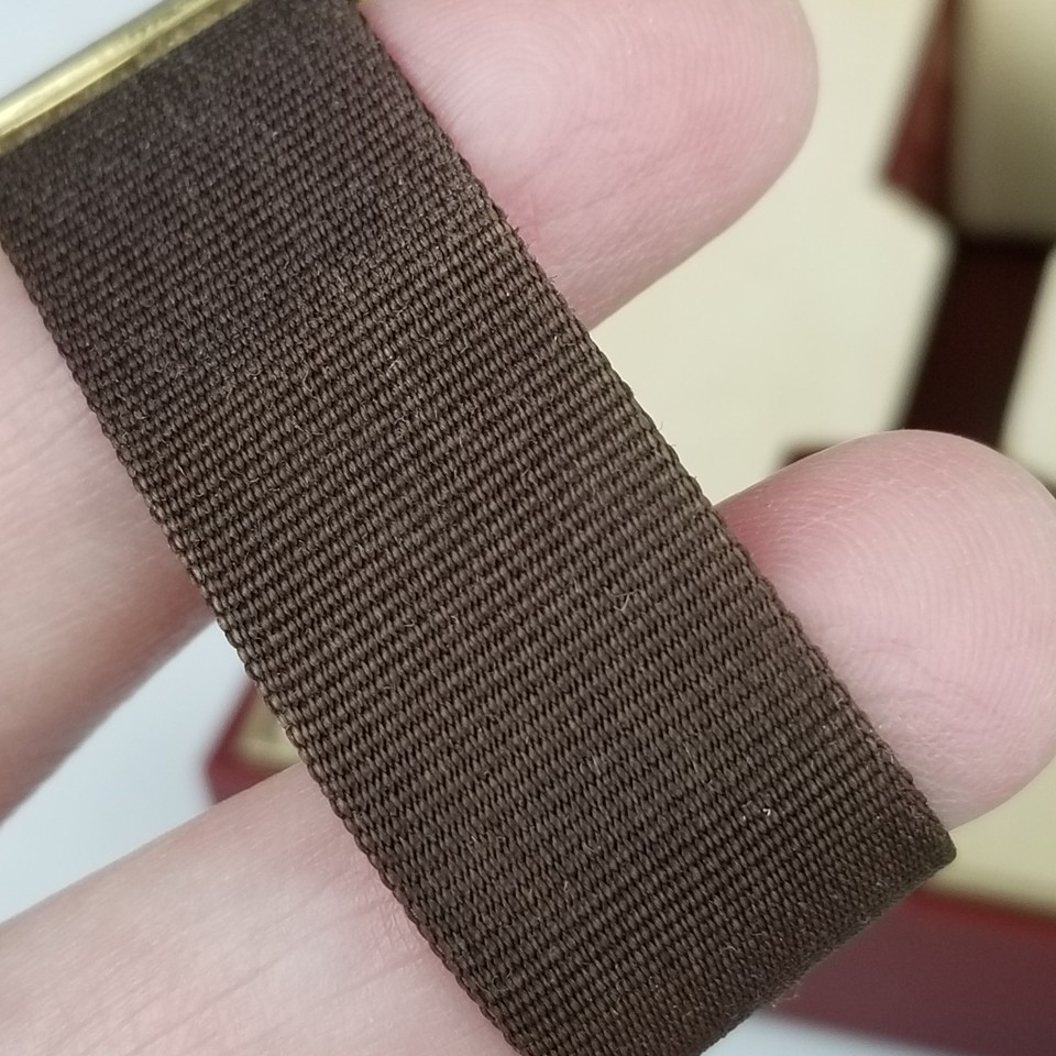 28mm. Gold tone watch case with brown canvas type band.