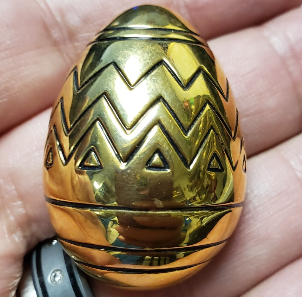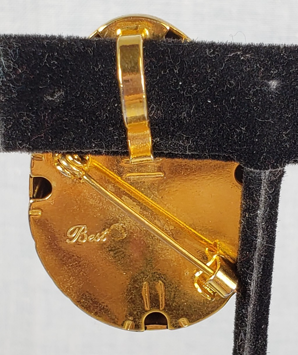 A vintage, gold-tone Easter egg brooch/pendant, signed "BEST," and etched in black isA collectible Piece. These brooches are often found with a gold or silver tone and can be worn as either a brooch or a pendant. The "BEST" marking indicates it was made by the BEST Jewelry Company, costume jewelry manufacturer from the mid-20th century.