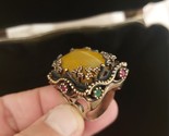 This exquisite statement ring showcases a genuine yellow agate (carnelian) gemstone as its centerpiece, surrounded by delicate root jade (green) and root ruby (red) accents. The intricate, vintage-inspired design is reminiscent of Ottoman and Byzantine jewelry styles, making it a unique addition to any collection.