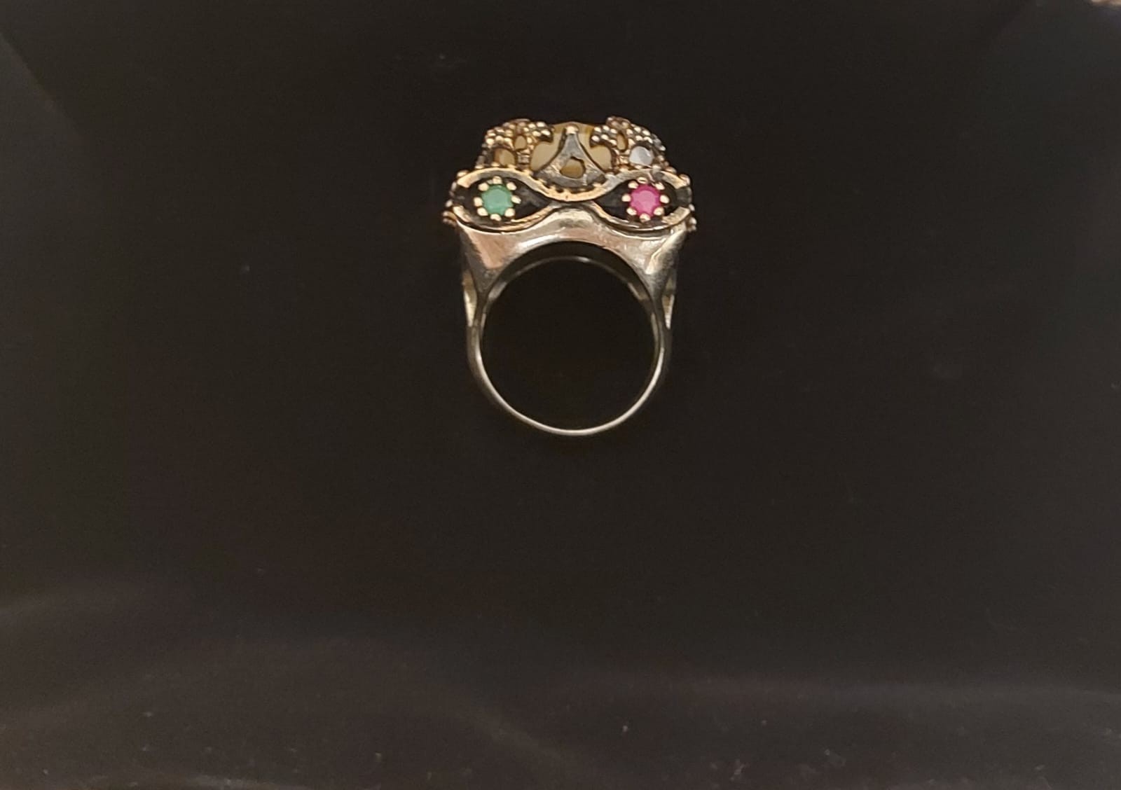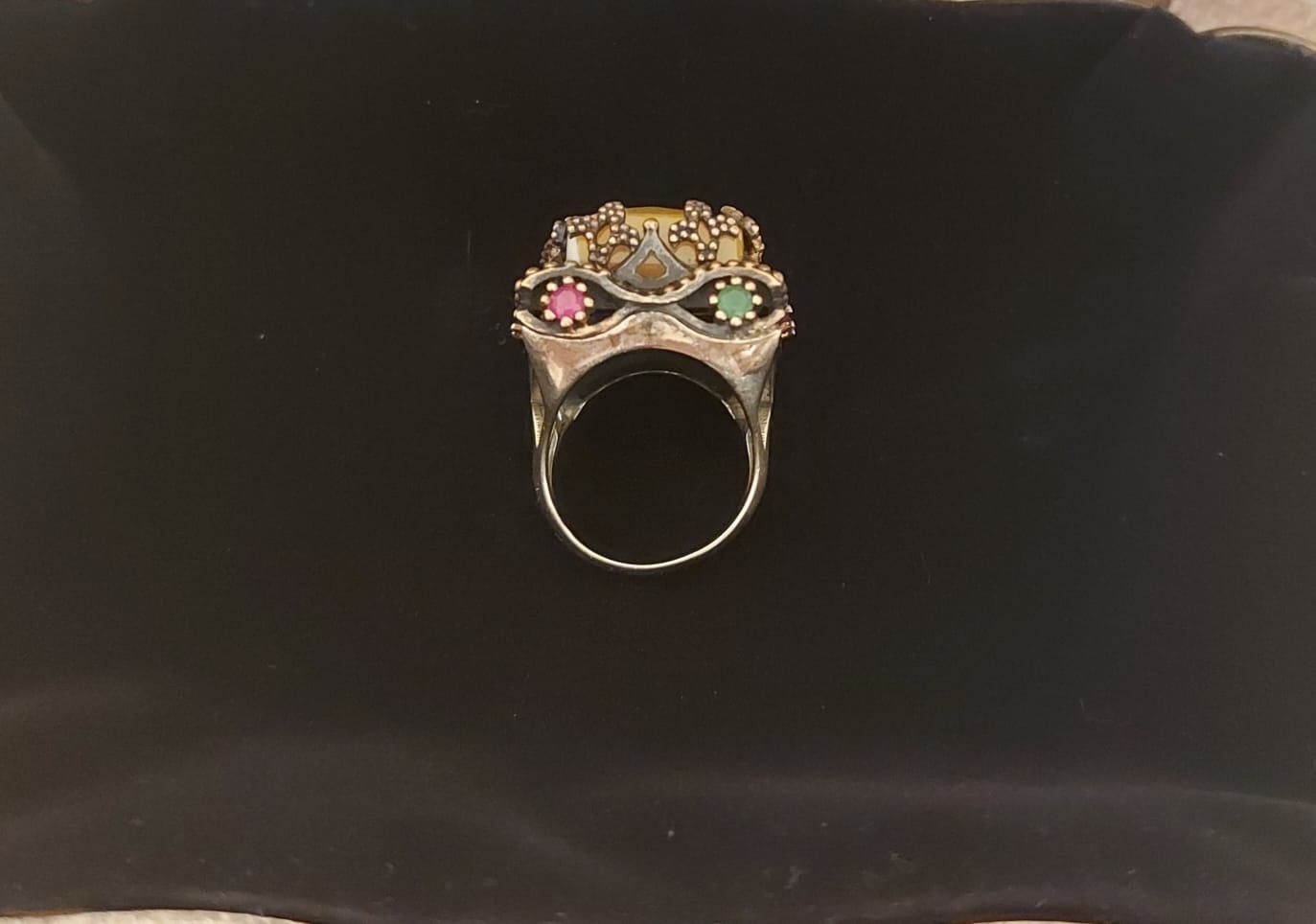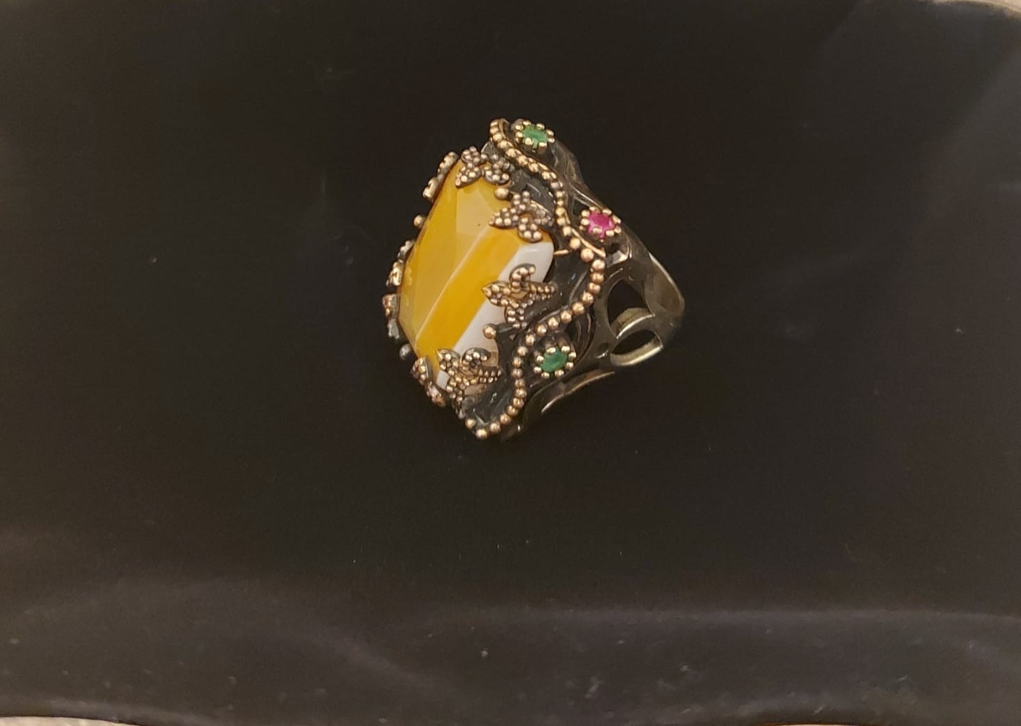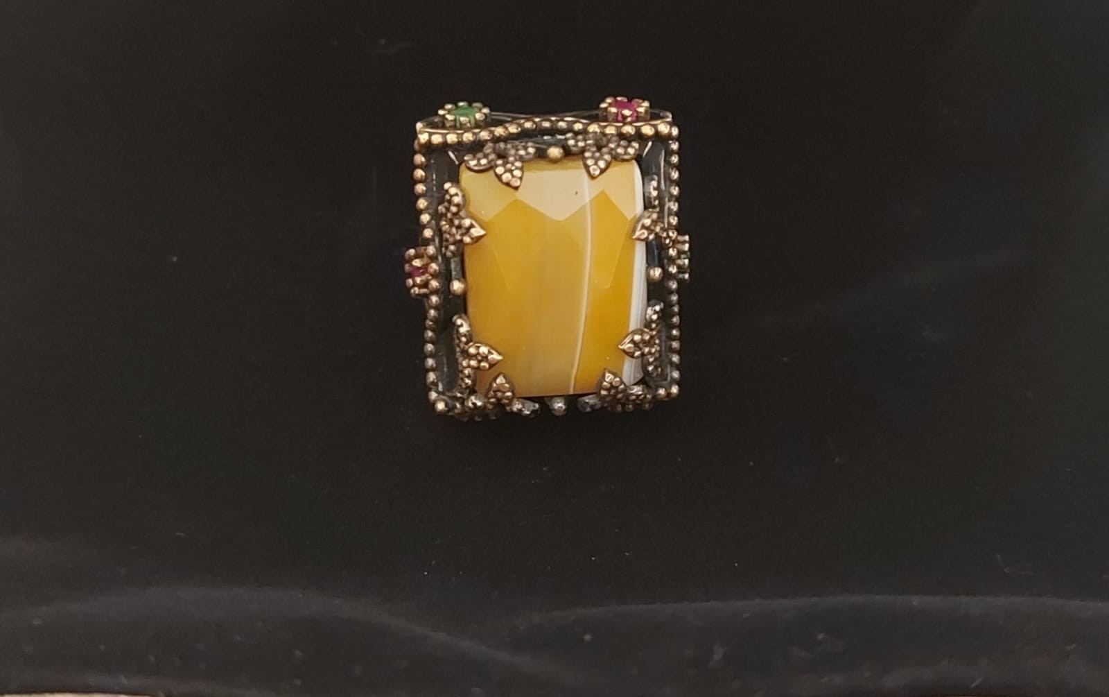 This ring is not just jewelry?it?s a piece of history. The combination of warm yellow agate with the striking red and green accents creates a truly regal, eye-catching look. Perfect for bohemian fashion lovers, vintage collectors, or anyone seeking a one-of-a-kind accessory.