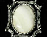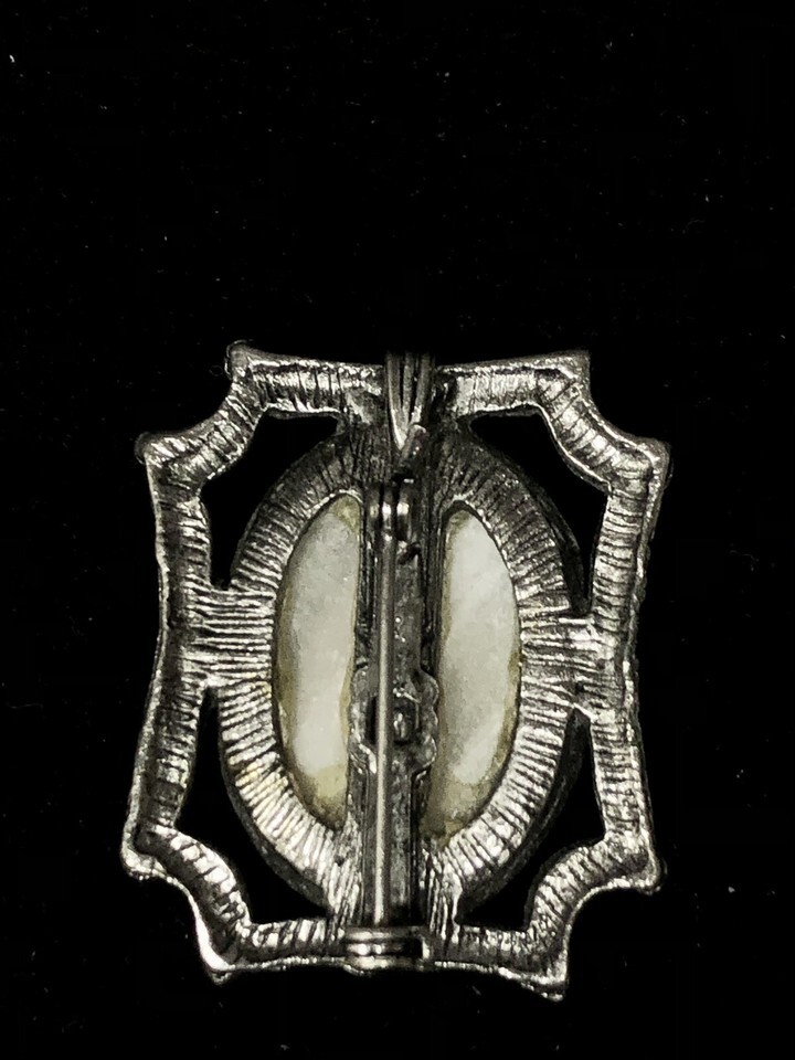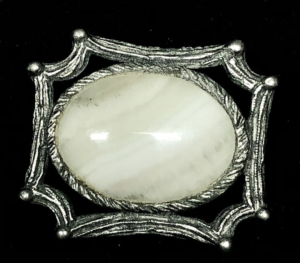 This vintage brooch features a silver tone design with a faux agate stone in an oval shape. It can be worn as a brooch or a pendant for a necklace. The item is 1.5 inches long and has a cream color. It is a fine jewelry piece suitable for women, adding a vintage touch to any occasion.