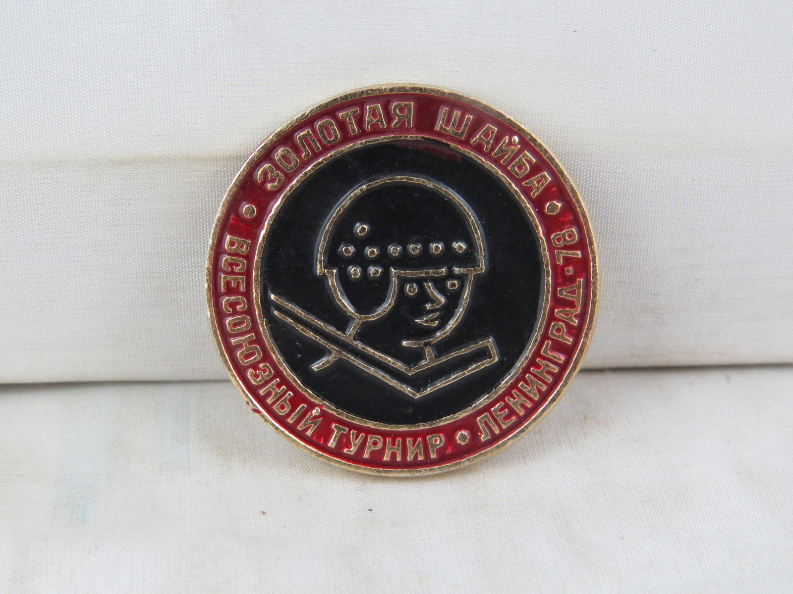Up for sale is a vintage soviet hockey pin. The pin is for Club Zolotaya Shaiba and is for their participation in the Komsomol Cup in 1978 which was held in Leningrad. The middle of the pin has a black base colour with a child's hockey player and a hockey stick stamped in. The outer ring of the pin is red and has Zolotaya Shaiba Junior Tournament Leningrad 1978 stamped in. What a great addition to any hockey collection.