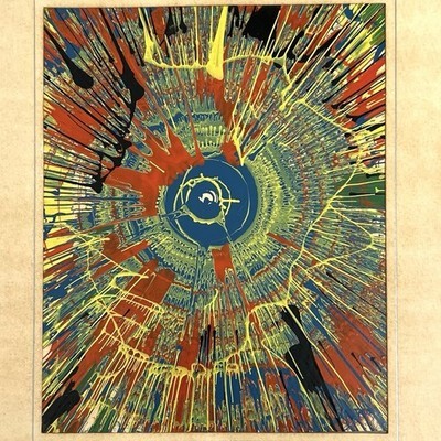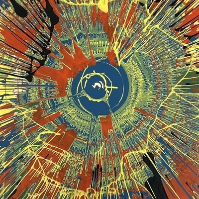 Paint applied by centrifugal force while spinning ? producing a vivid abstract design with radiating motion and energy.