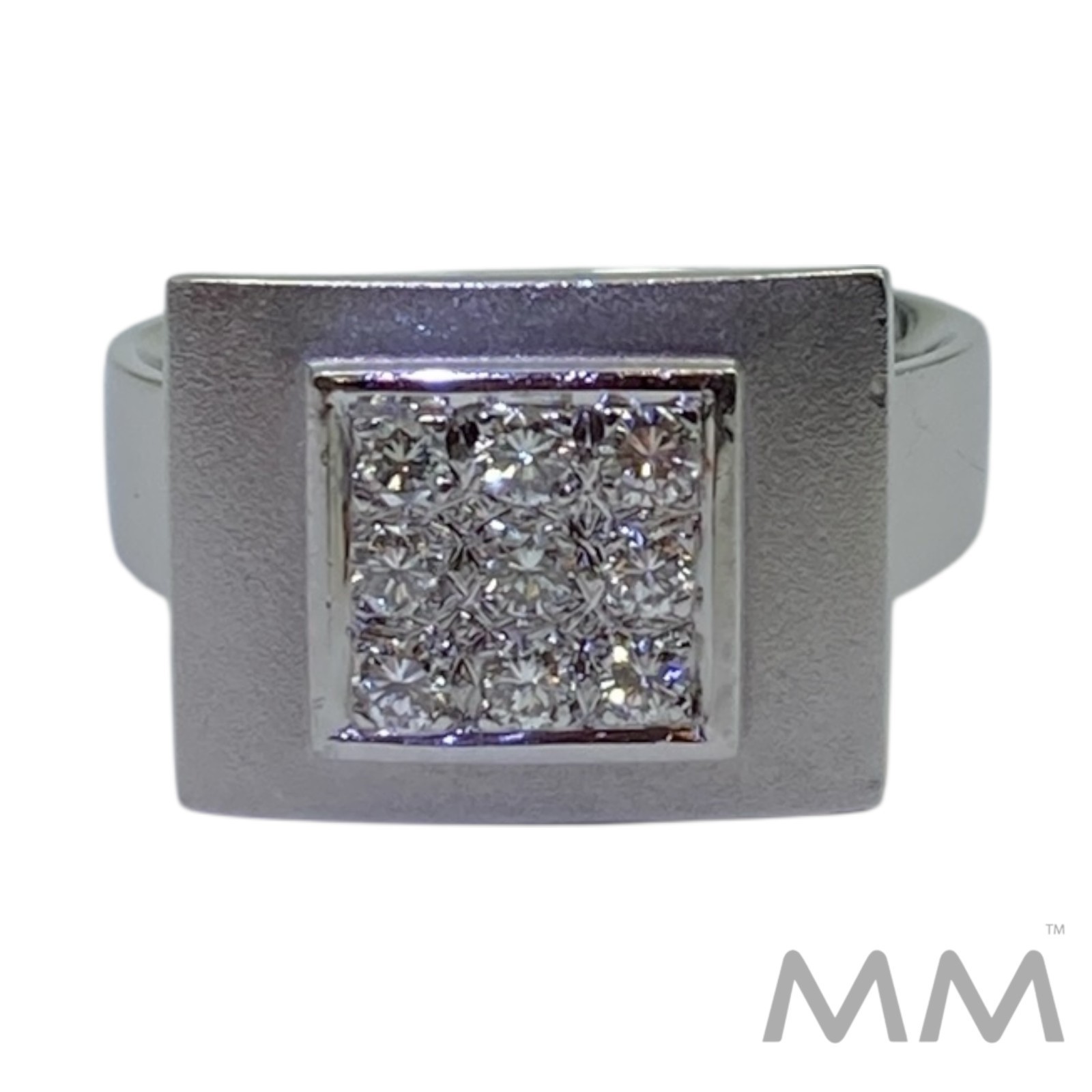 Description: This pre-owned Stuart Moore platinum ring is finely crafted and set with nine round diamonds totaling .22ctw, graded VS1 clarity and G color for exceptional brilliance. The sleek 12-gram design balances durability with refined elegance, making it a versatile piece for everyday wear or special occasions. Currently a size 5.75, the ring features an inside engraving that reads ?I love you W.A 2000? which can be removed upon request for an additional charge.