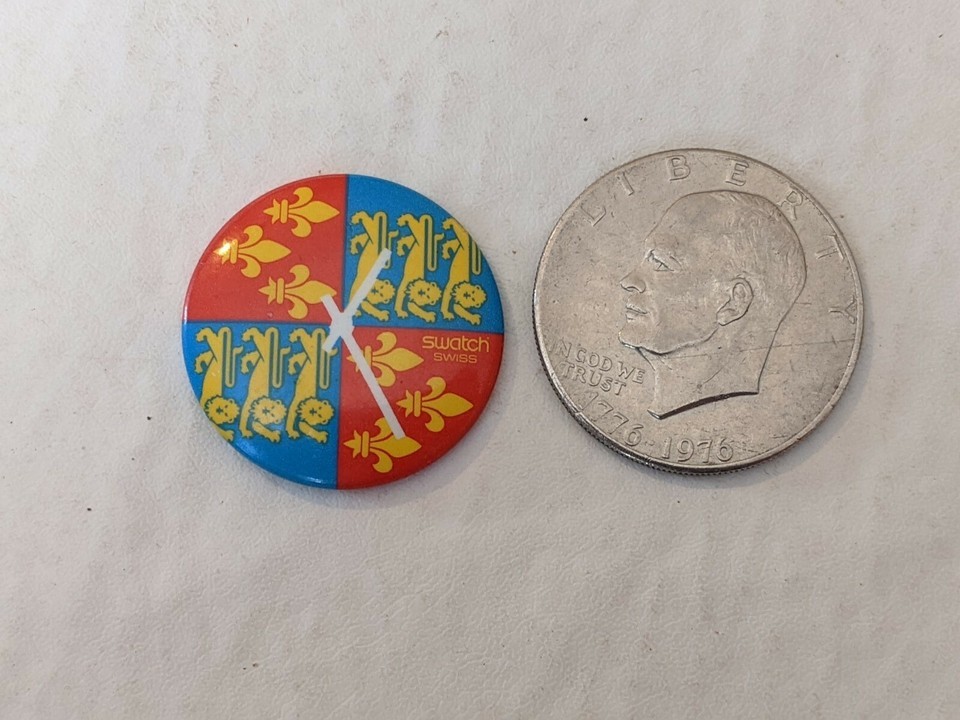 - Vintage Swatch Watch Swiss Pin Button 1-3/8" Blue Red Yellow Fleur De Lis- sh...
