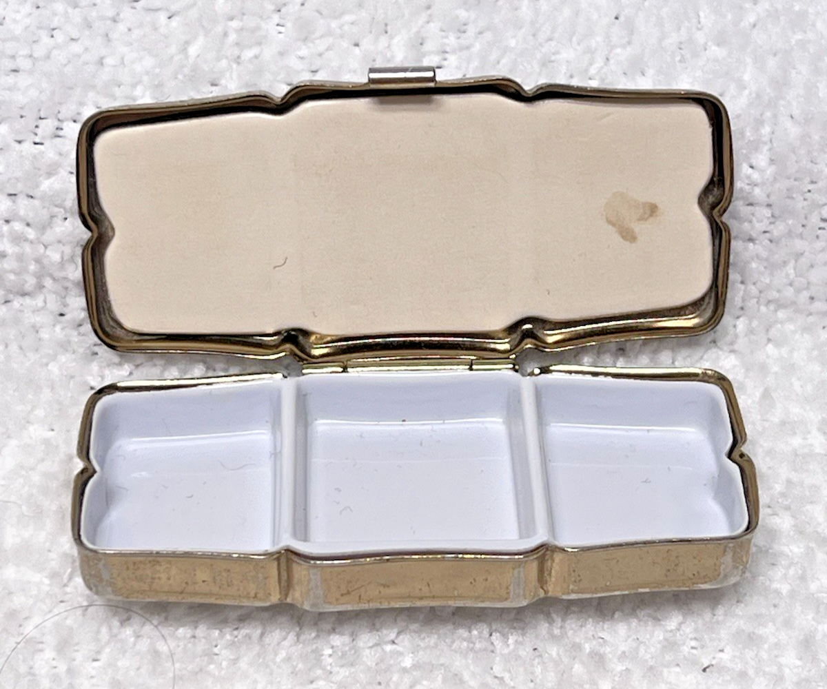 Vintage "Tapestry" Pillbox Pill Box 2 1/2 x 1 1/4" Has Liner w Divider The gold has wear but overall clean sweet and nice