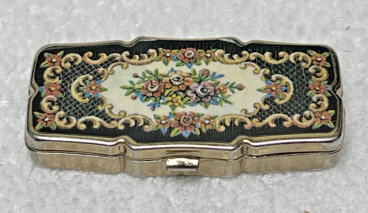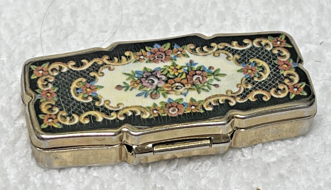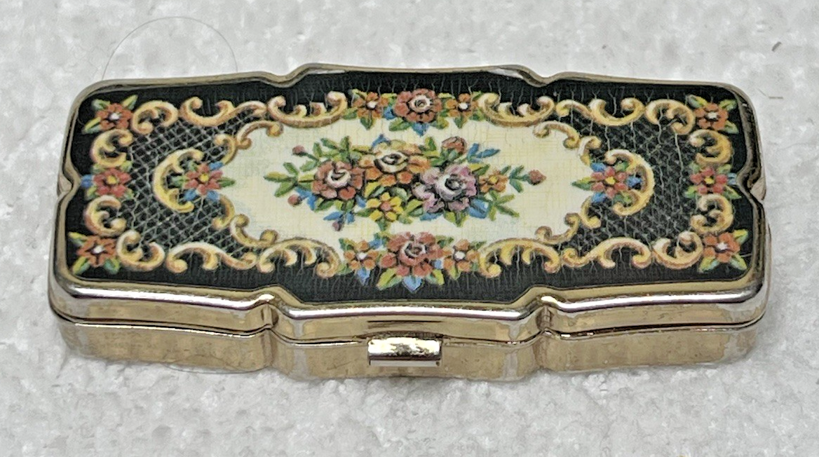 - Vintage "Tapestry" Pillbox Pill Box 2 1/2 x 1 1/4" Has Liner w Divider