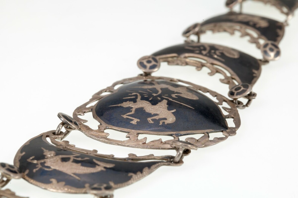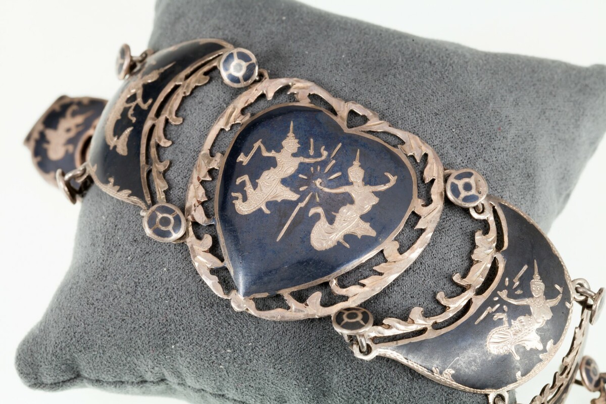 - Vintage Thai Silver Siam Niello Enamel Panel Bracelet 7.50"