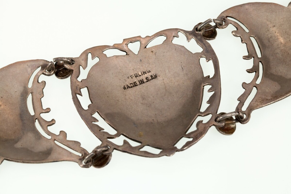 Gorgeous Hand made Bracelet with Dancer caricatures tooled on to heart shape link in the middle and half moons on the rest of the links Condition: Great vintage condition with one small jump ring missing decoration. See photos Local Pick-up is available in our showroom. All international packages will have the required customs declaration and value of order. Your continuing satisfaction is very important to us. We offer a 30 day money back return policy. If you are unhappy with your purchase for any reason, please notify us so that we can begin the returns process. All items for sale are available for viewing at our Southern California showroom. We would like to thank all of our loyal customers for their continued support. If you have any questions, comments or concerns, please click