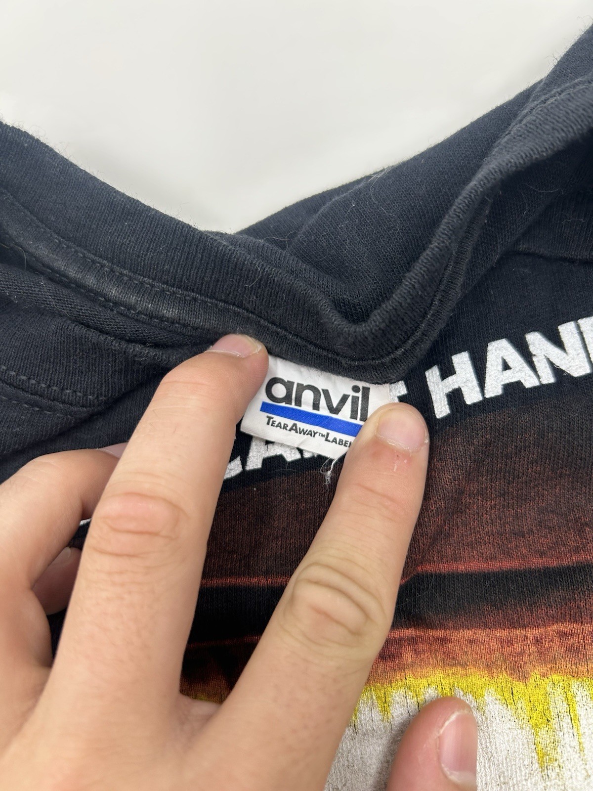 The Vintage The Hangover T-shirt is a rare 2009 movie promo item featuring a graphic print of the film's iconic scene in Las Vegas. Made of cotton knit fabric with a crew neck and short sleeves, this 2XL t-shirt by Anvil is perfect for fans of the comedy film. The multicolor design and regular fit make it suitable for both men and women, ideal for all seasons wear. This piece of Warner Bros merchandise is a must-have for collectors of movie-themed memorabilia.