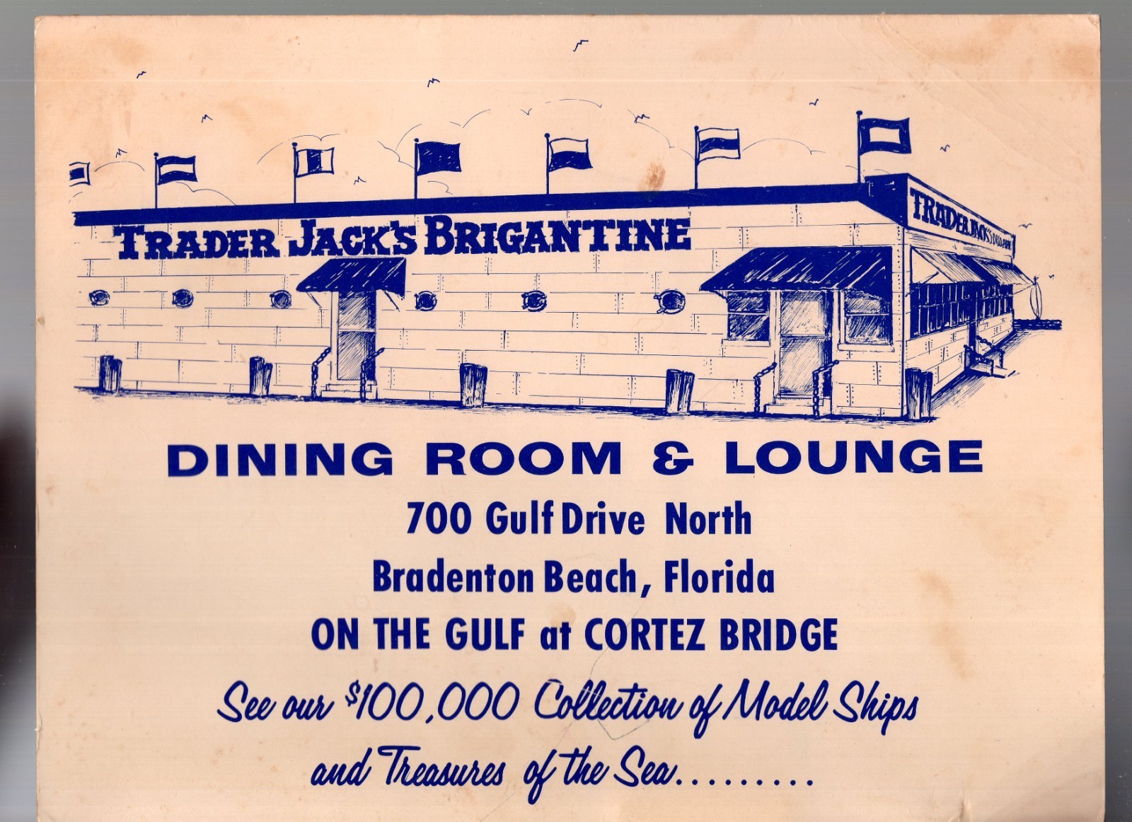 Capture a piece of Old Florida charm with this original menu from Trader Jack?s Brigantine Dining Room Lounge, located at 700 Gulf Drive North, Bradenton Beach, on the Gulf at Cortez Bridge.