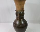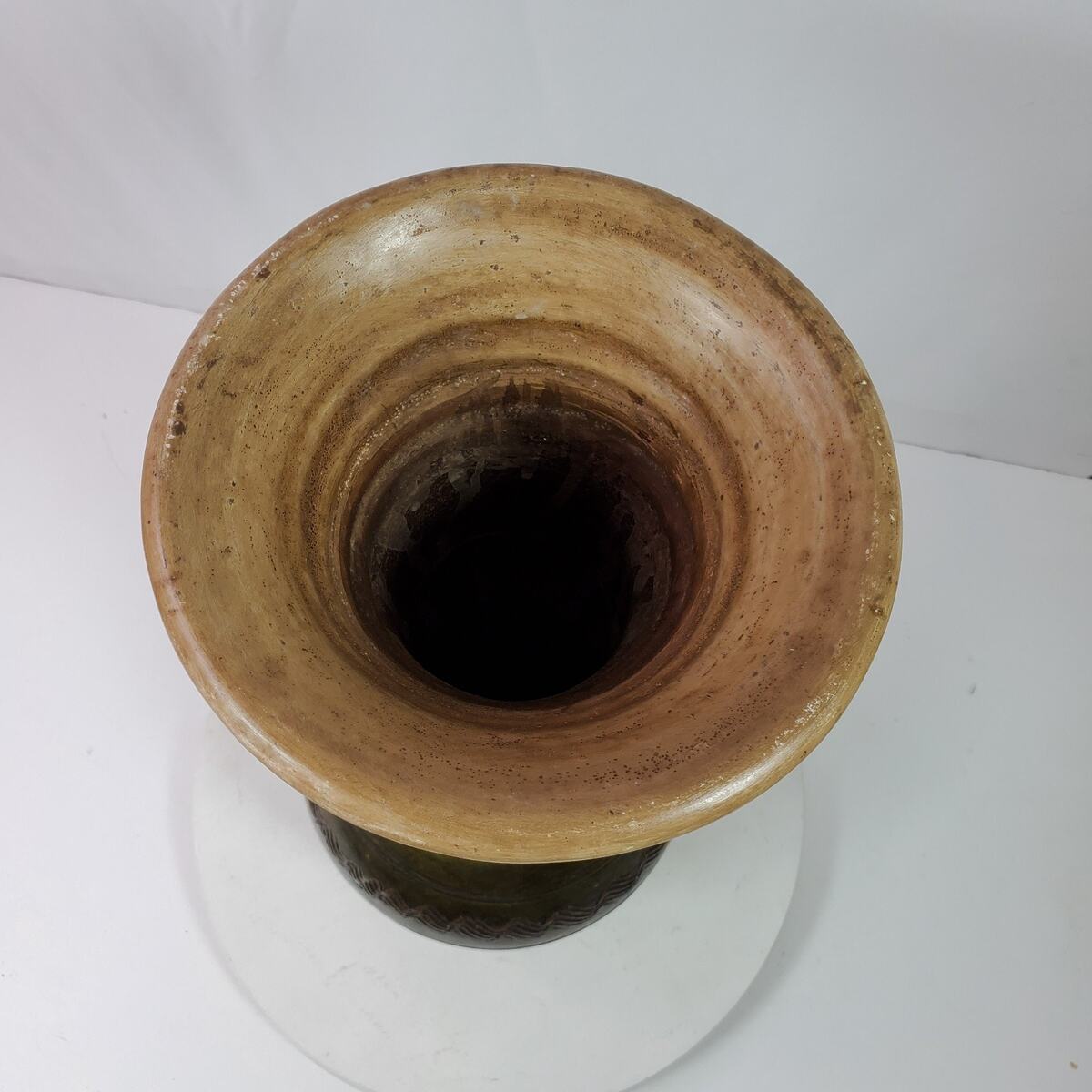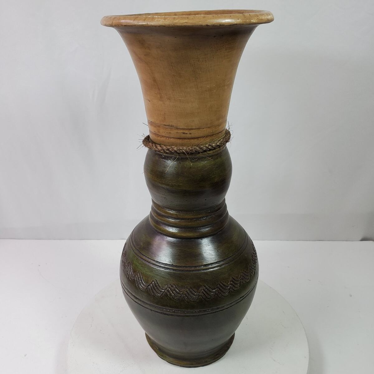 Vintage Tribal Etched Ceramic Vase LARGE Green Tan Earth Tones 18 Inch Tall