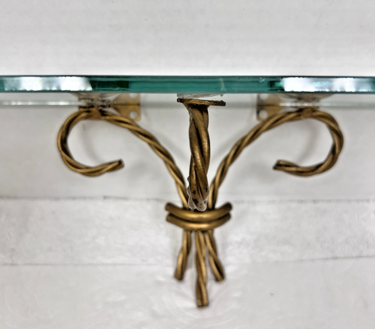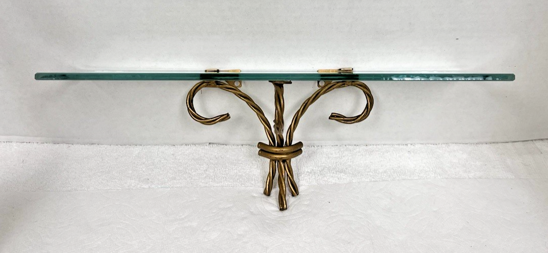 Vintage Twisty Gold Metal Fleur De Lis w Glass Wall Shelf Hollywood Glamour