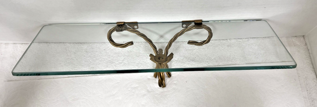 - Vintage Twisty Gold Metal Fleur De Lis w Glass Wall Shelf Hollywood Glamour