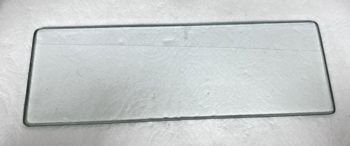 the glass is 14 1/4 x 4 3/4 x 1/4 inch thick with curved corners the metal measures about 5 inches top to bottom and 6 3/4 inches across the twists. Glass is in great shape you should add fresh felty dots as they are missing also you will need screws to hang it (2) we have 2 for sale price is for 1 we can combine shipping
