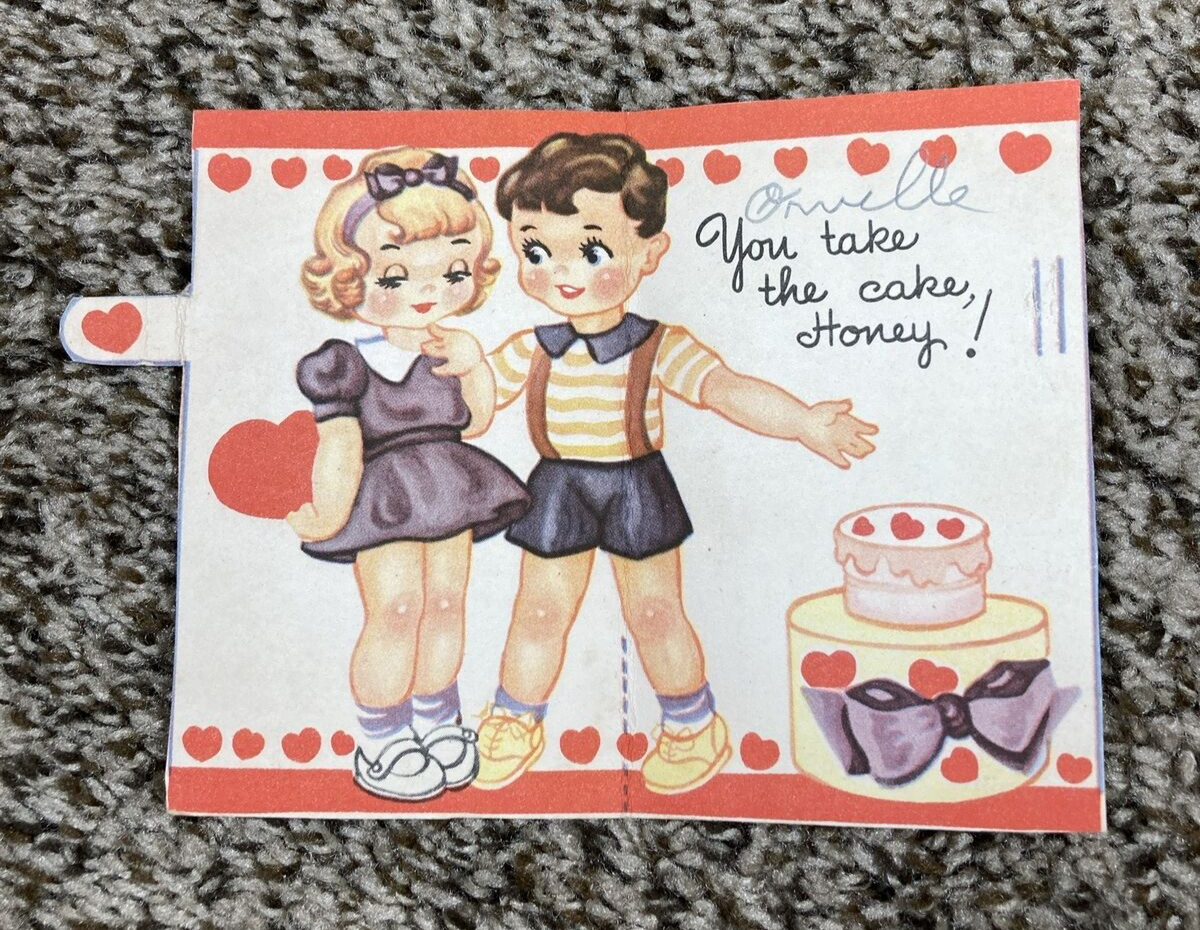 Vintage Valentines Day Card Boy Girl w Cake You Take The Cake