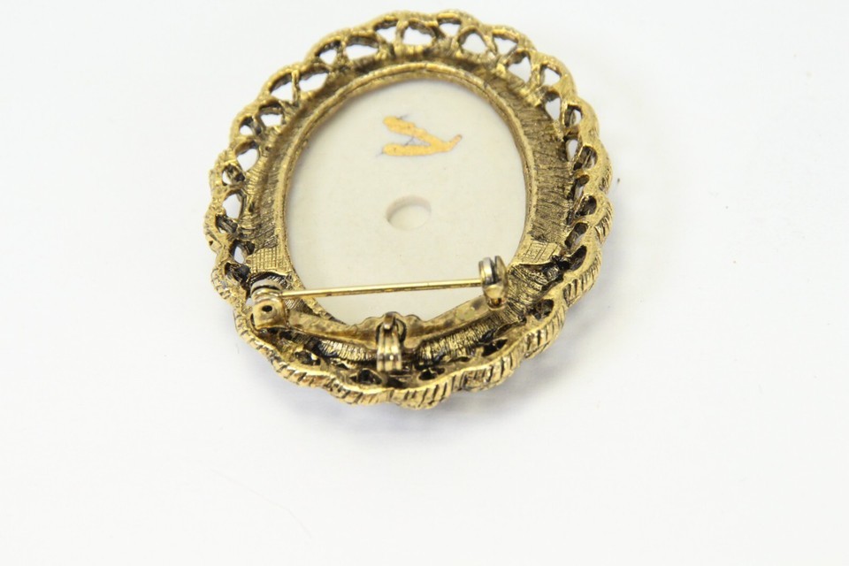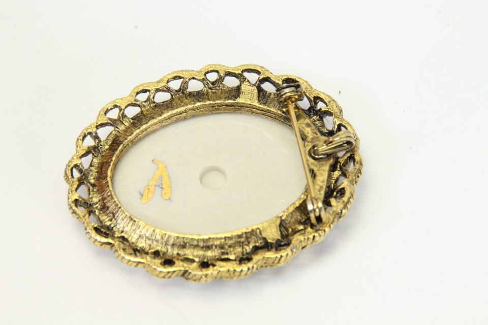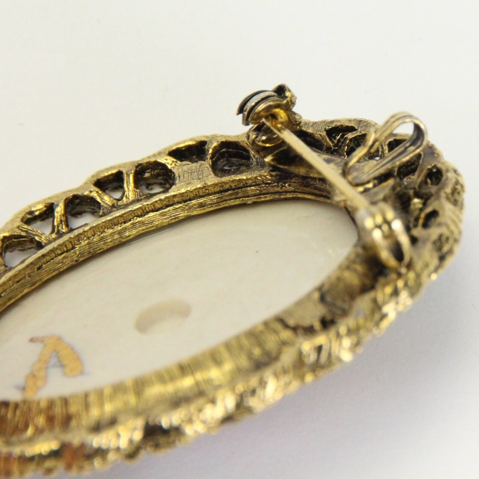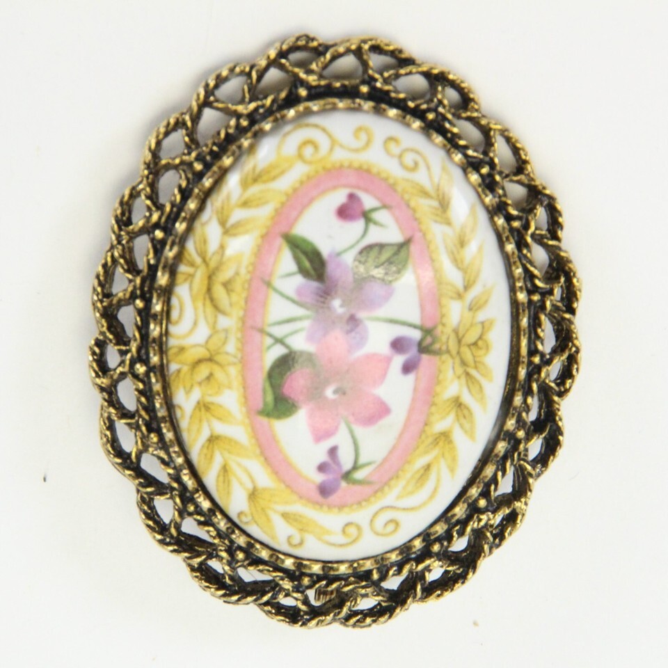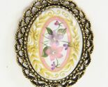 - Vintage Victorian Metal Oval Brooch Pendant Purple Yellow Rose Filigree 2 Inch