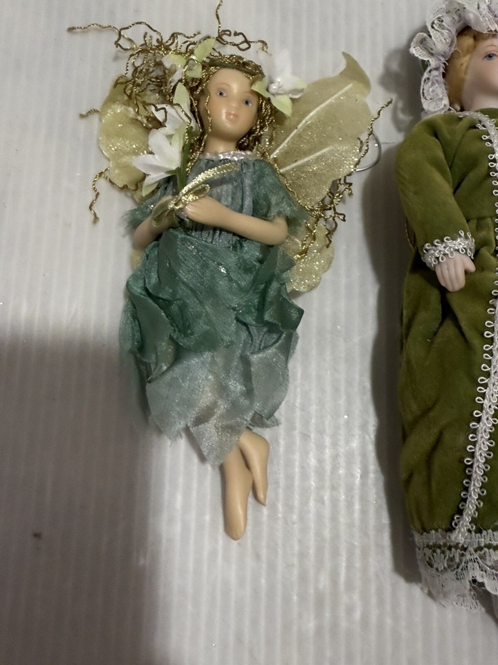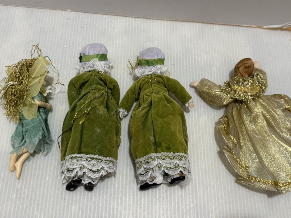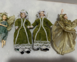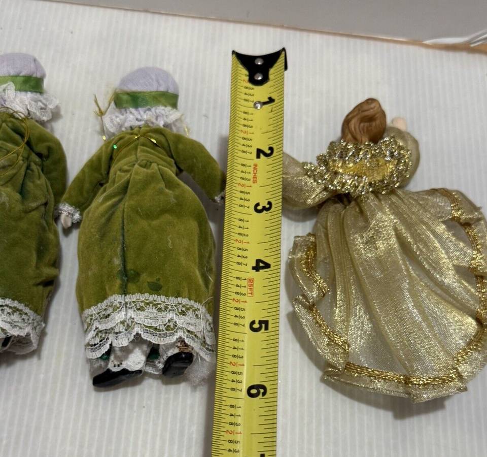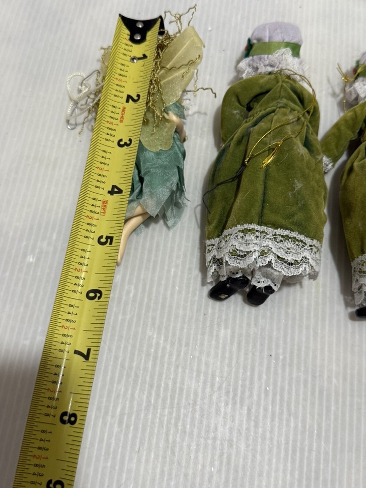 - Vintage Victorian Porcelain 4 PC Christmas Ornaments Green Velvet Dolls/ Angels