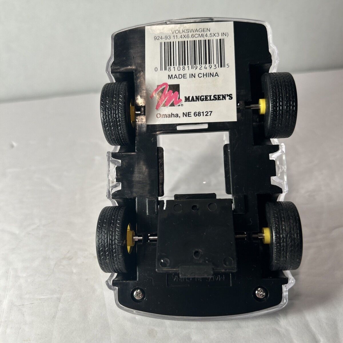 This vintage Volkswagen VW Beetle Bug toy car was made by Mangelsen?s and features a unique clear plastic design that allows you to see inside. A fun twist on the classic Beetle, it has black body details, yellow wheels, and a see-through top. This collectible piece is ideal for Volkswagen fans or toy car enthusiasts and makes a great display item.