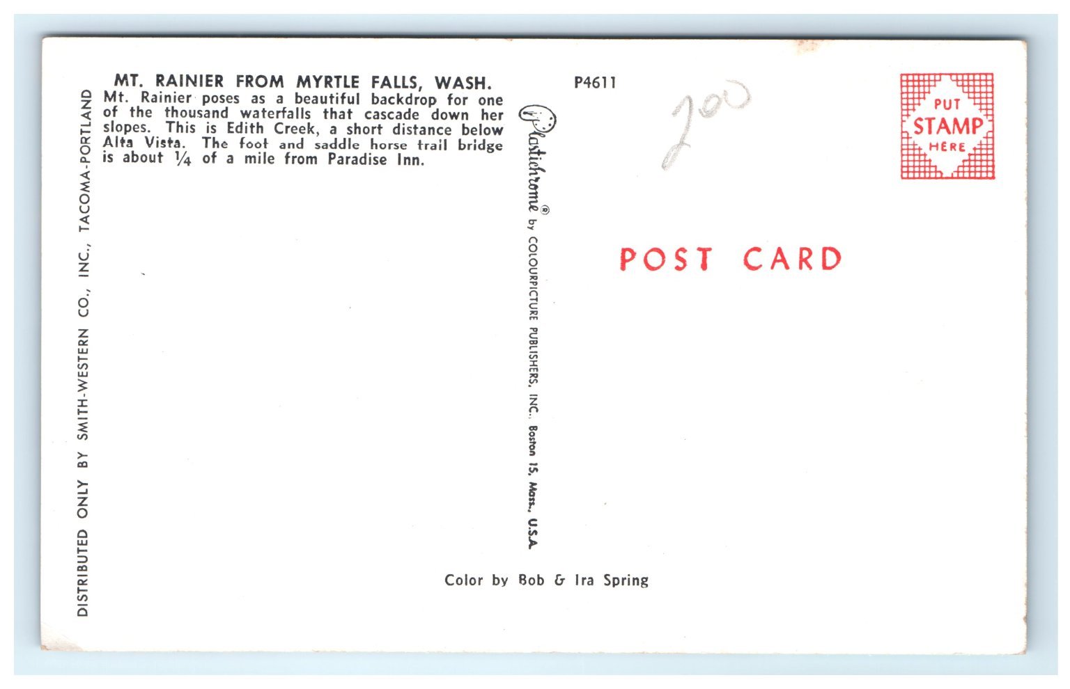 Produced by Colourpicture Publishers, Inc. and distributed by Smith-Western Co., Inc., this chromolithograph postcard features vibrant, rich colors enhanced by a chrome finish for added durability and shine. The card measures the standard 5.5 x 3.5 inches, with crisp printed text detailing the location and scenic highlights. The back credits colorists Bob Ira Spring, known for their work in enhancing postcard imagery. A wonderful addition for collectors of vintage travel memorabilia or nature-themed postcards.