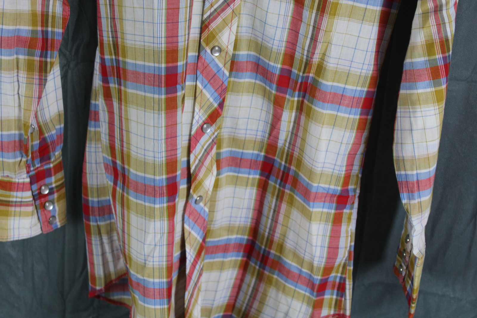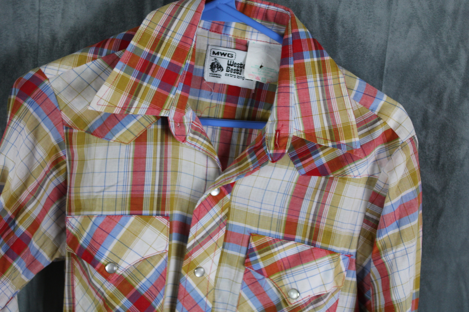 Up for sale is a vintage Western shirt by MWG. It has a yellow base colour with a red and blue plaid pattern over top. Like all good Western shirts, it has pearl snaps for all closures. What a great shirt do not miss out on it.