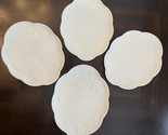 Set of 4 vintage Westmoreland milk glass oval plates, featuring the classic Paneled Grape pattern with raised grapes and leaves. These mid-century plates have a scalloped rim and glossy finish, perfect for display or use as serving/dessert plates.