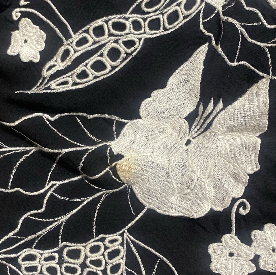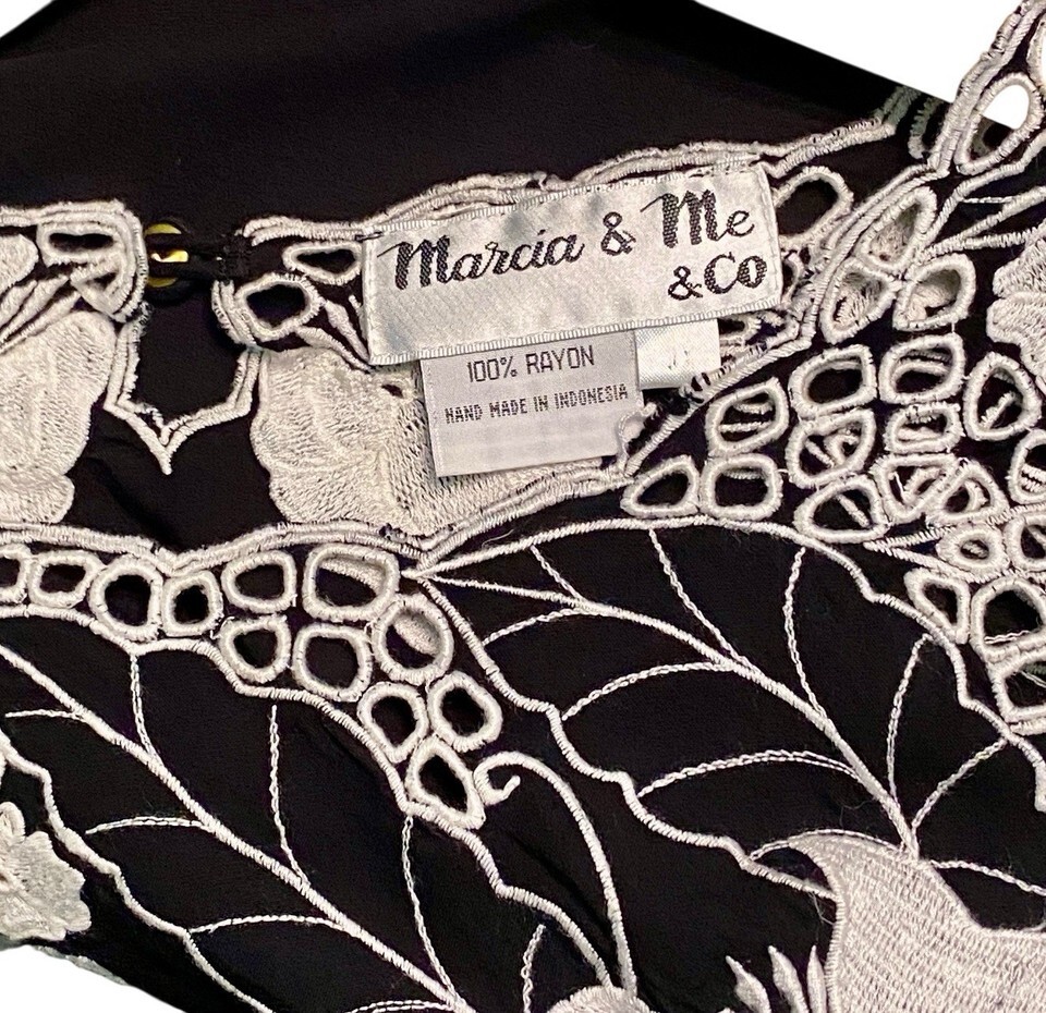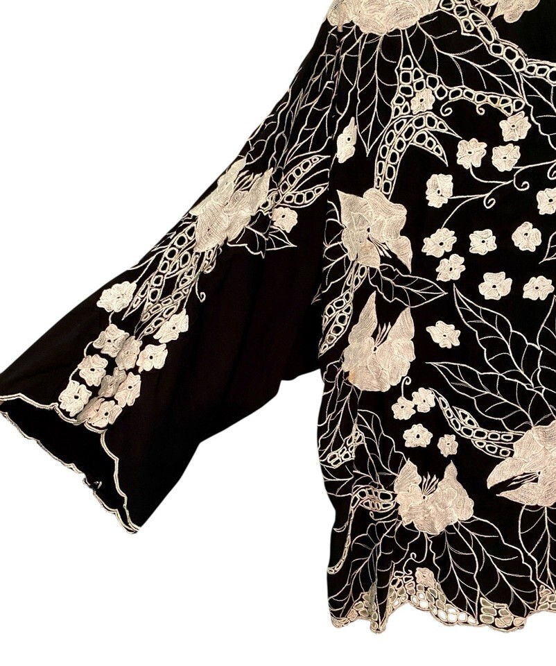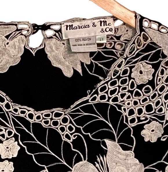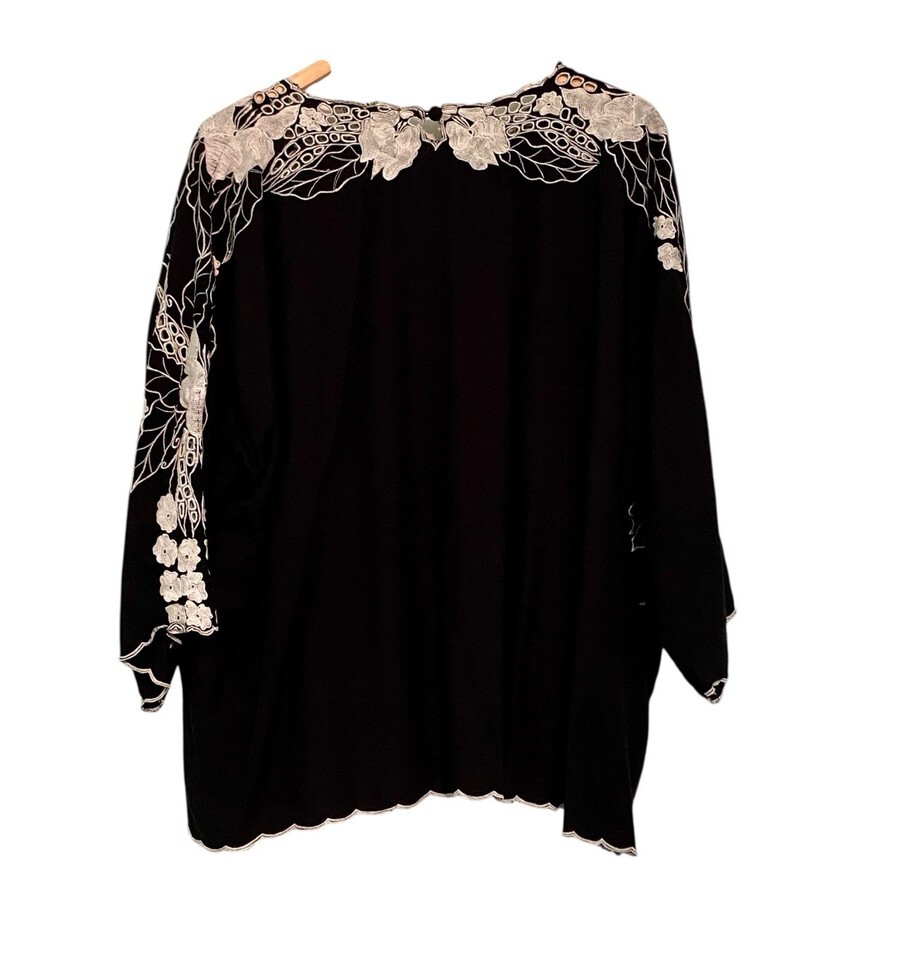 - Vintage Womens Blouse Size 3X Black White Cutwork Rayon 3/4 Sleeves Flaws
