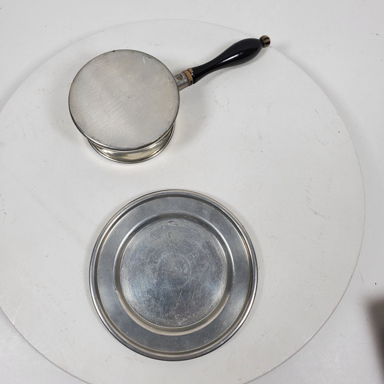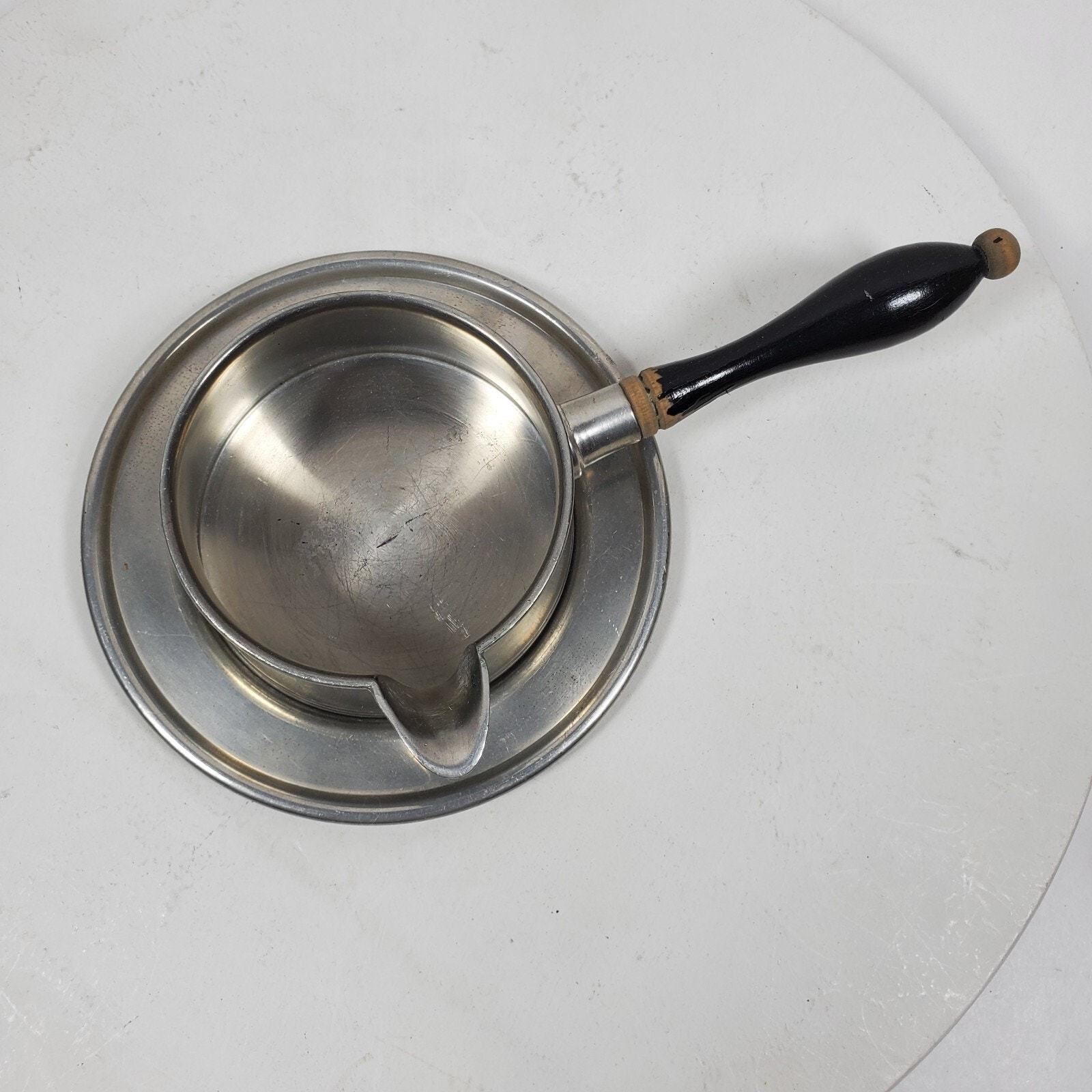 - Vintage Woodbury Gravy Pitcher Pewter w/ Wood Handle & Tray