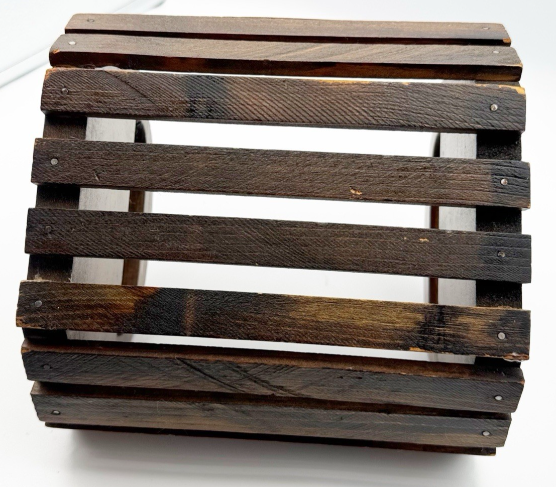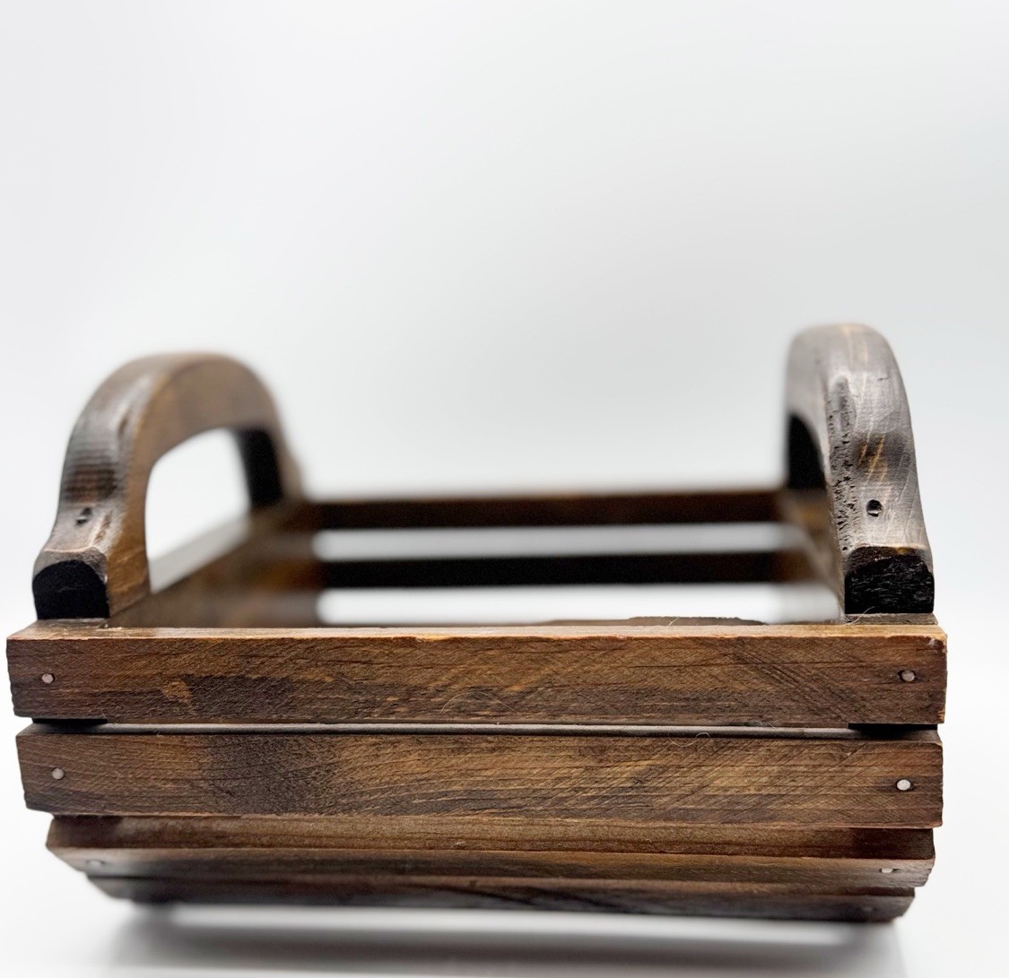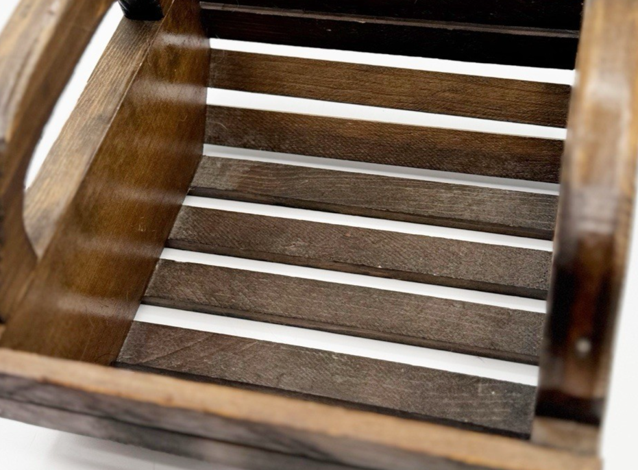 Charming vintage, rustic dark wood basket made up of wooden slats and rounded handles