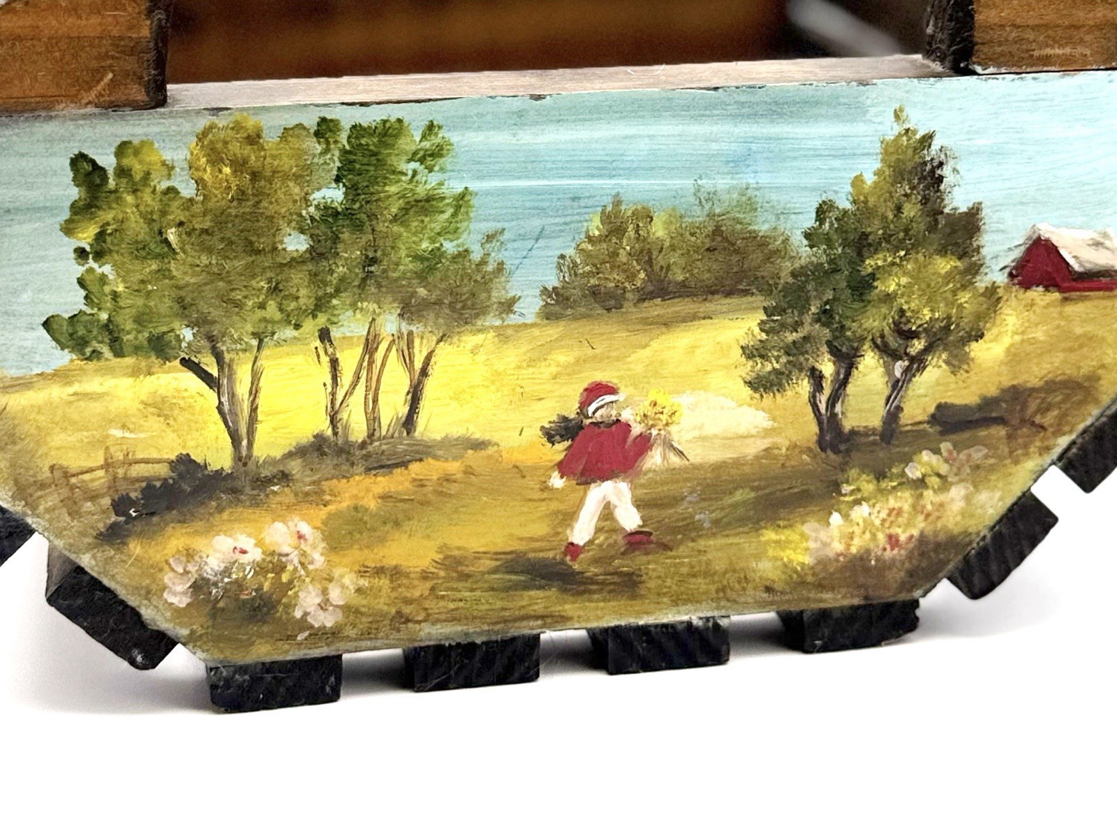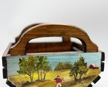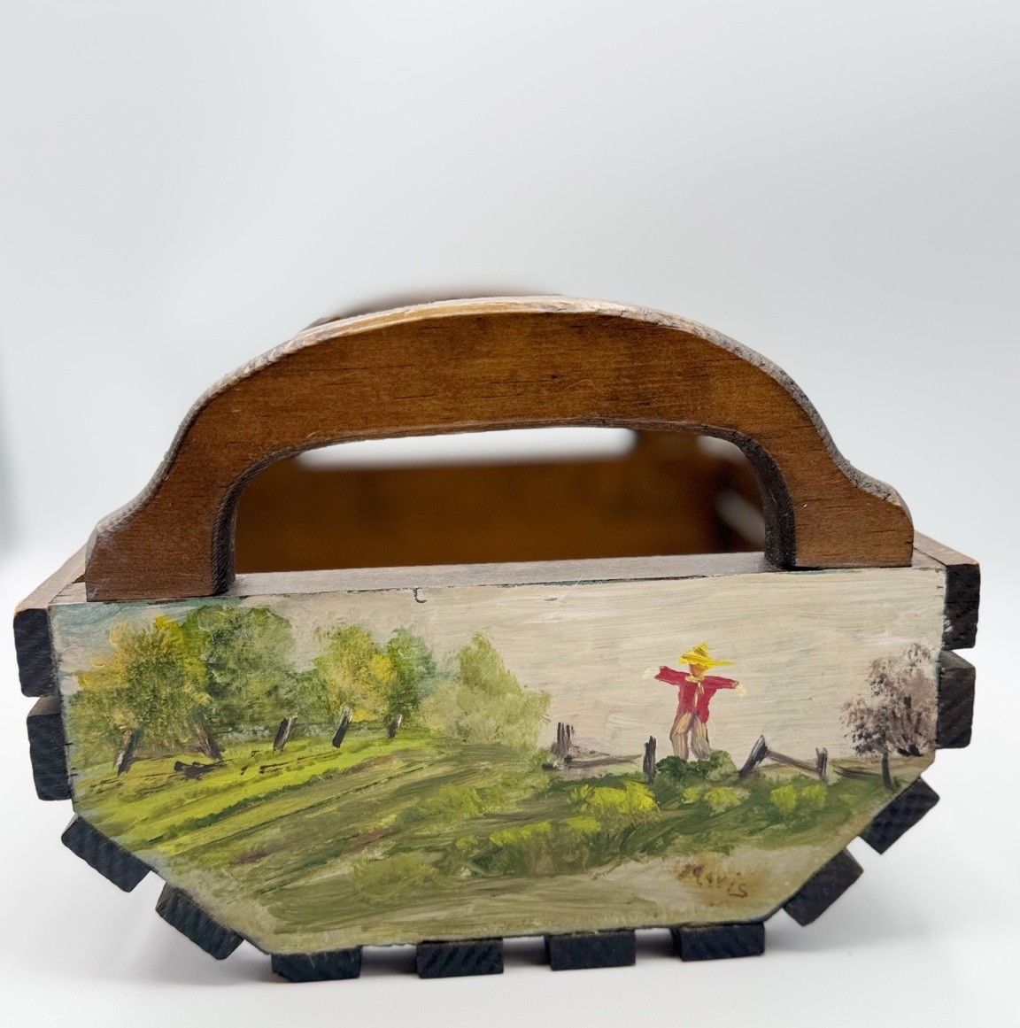 - Vintage Wooden Slat Basket w/ Handles Hand Painted Outdoor Farm Scene Dark Wood