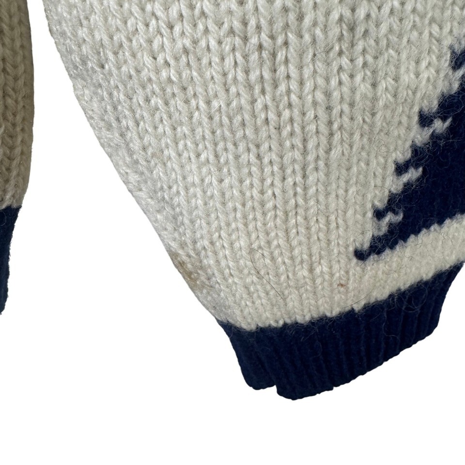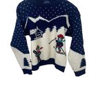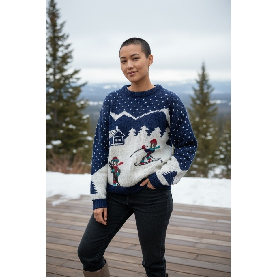 This charming sweater showcases a delightful scene of skiers enjoying a snowy day alongside a cozy cabin, all rendered in a classic navy blue and white palette. Nostalgia and holiday cheer. A few spots on the white wool as pictured. Size and material tag missing but fits a women's sm-m. Pit 2 Pit 21 in., Length 21 in., Sleeve 19 in.