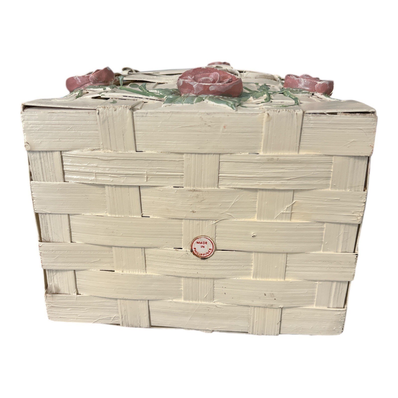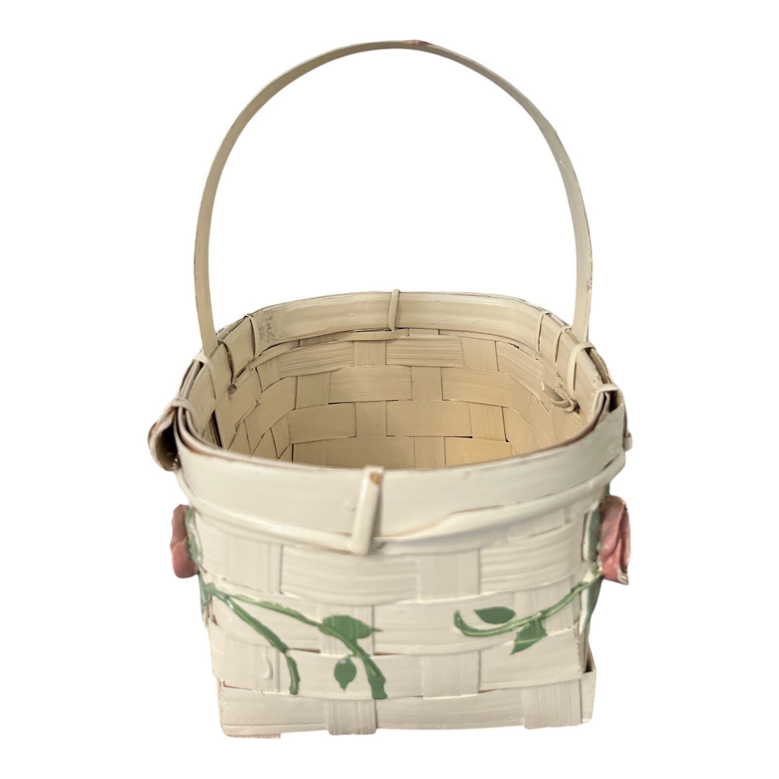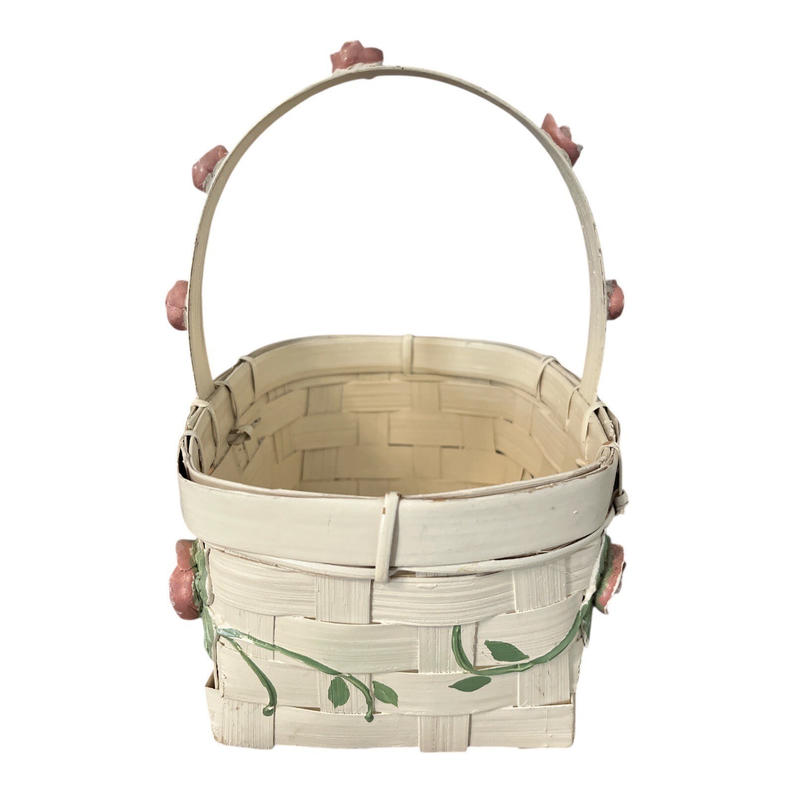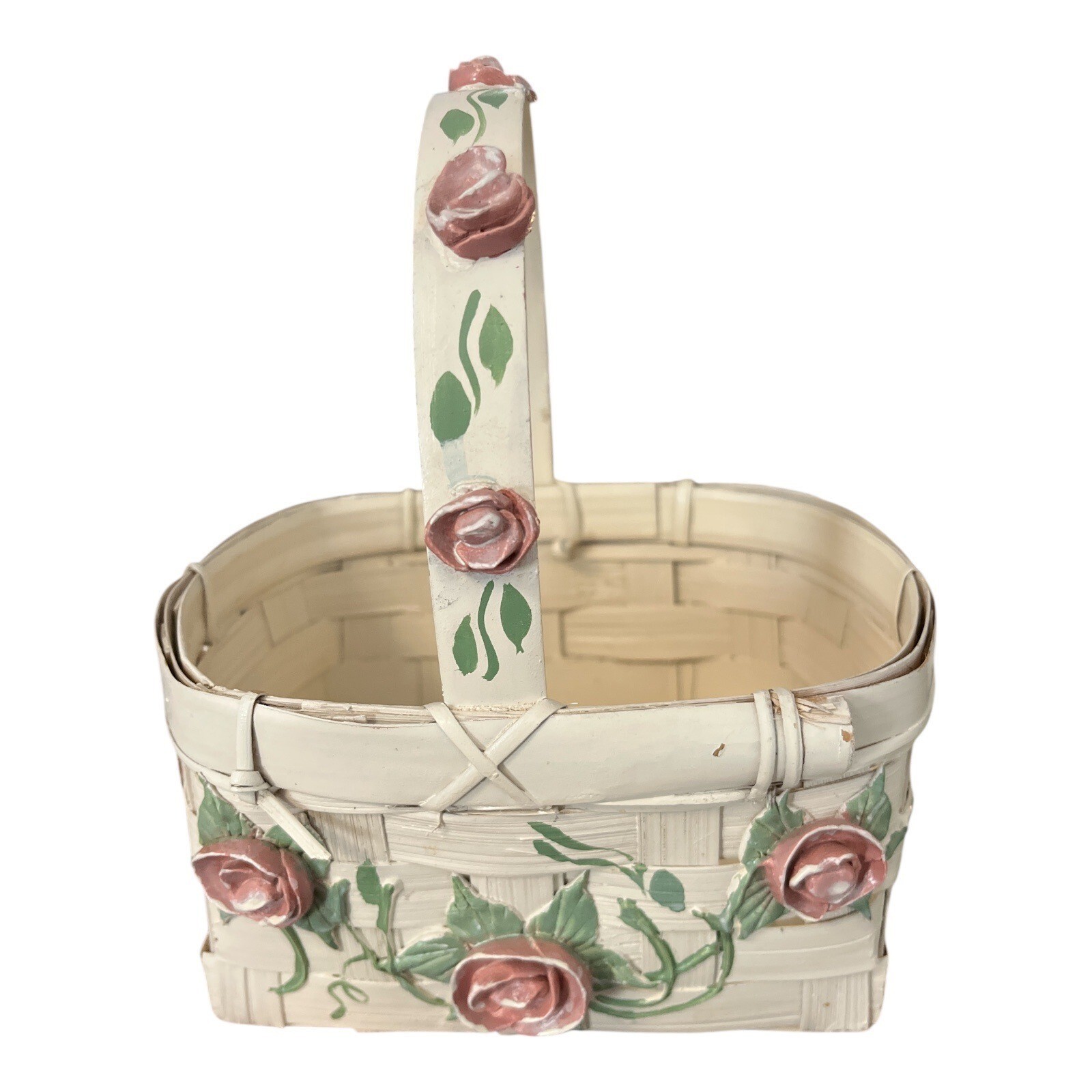 Add a touch of vintage charm to your home with this beautifully crafted woven basket, adorned with delicate ceramic rose appliques and hand-painted green leaves. The ivory-painted finish and sturdy handle, accented with matching ceramic roses, make this piece perfect for cottagecore or shabby chic decor. Made in the Philippines, this basket likely dates from the 1980s to early 1990s, a period known for such handcrafted decorative items.