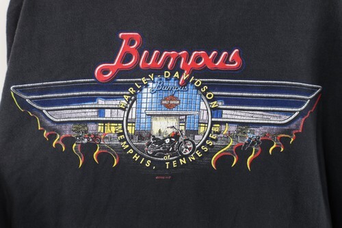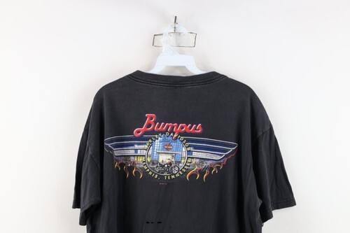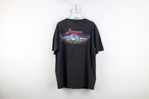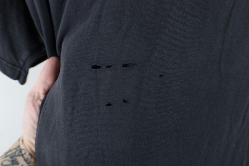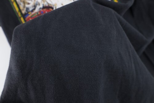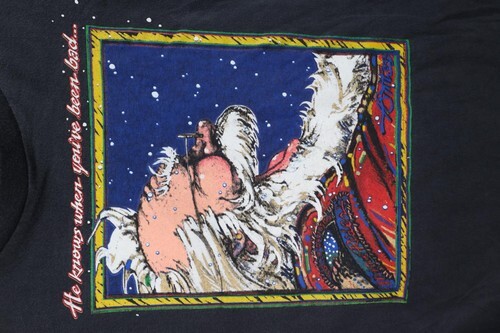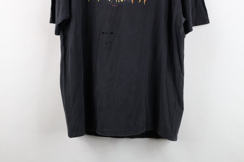 Holes middle back. Blemishes/discoloring throughout. Loose thread bottom hem. Collar, arms discolored. Graphics, color faded. Pilling. Made in USA
