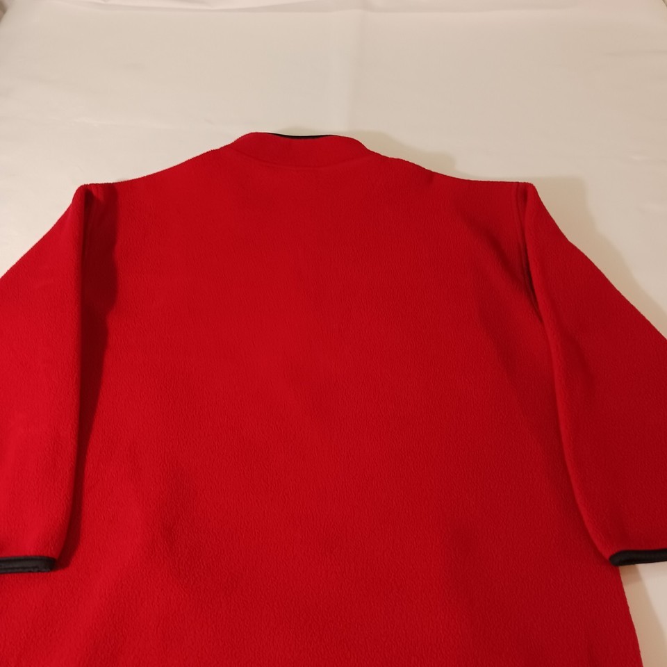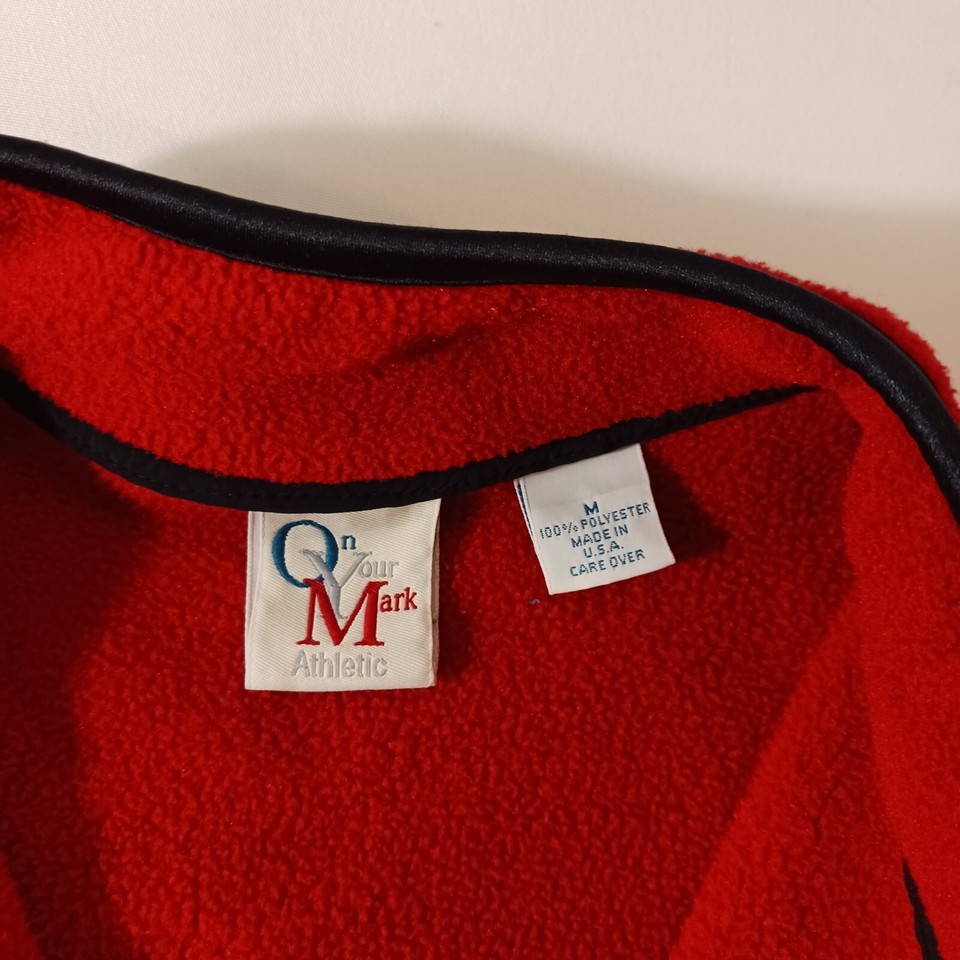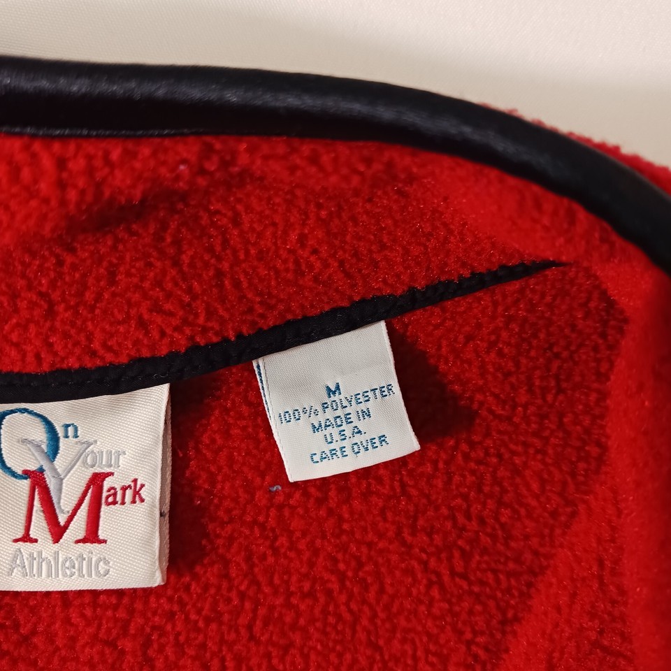 This vintage On Your Mark athletic jacket is a must-have for any gym enthusiast or casual wearer. Made in the USA in the 1990s, it features a durable polyester outer shell and fleece fabric type, with a mid-length jacket/coat design. The jacket is equipped with a 1/2 zip closure and pockets, making it perfect for all seasons and various activities such as weightlifting, cross-training, bodybuilding, and running jogging. The red color and solid pattern add a touch of patriotism to the jacket, making it a great addition to any USA-themed wardrobe.