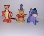 Vintage lot of 3 Disney Winnie the Pooh with a birthday hat, Tigger standing and smiling, Eyeore with a bath brush 3" figurines