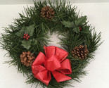 Vintage round artificial green pine wreath mistletoe pine cones red ribbon