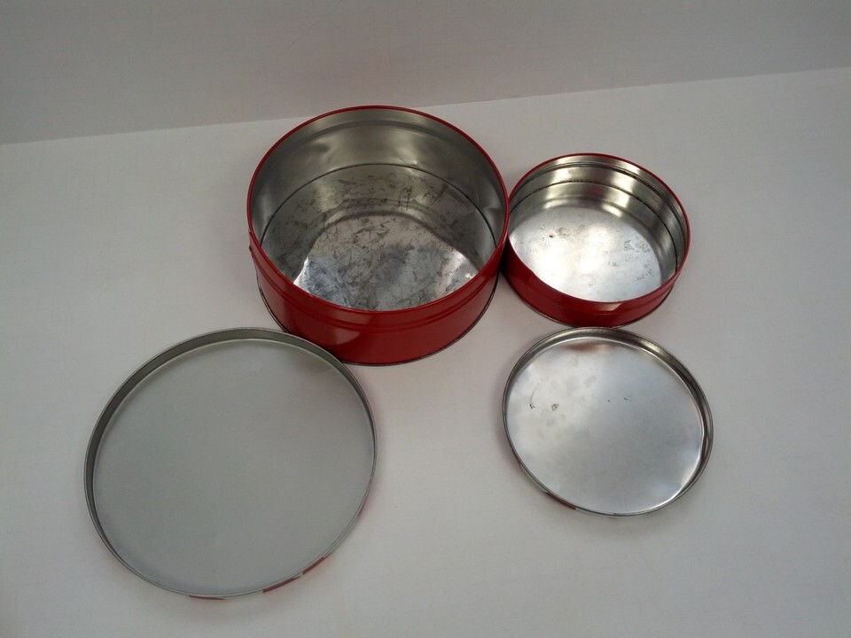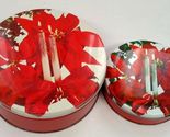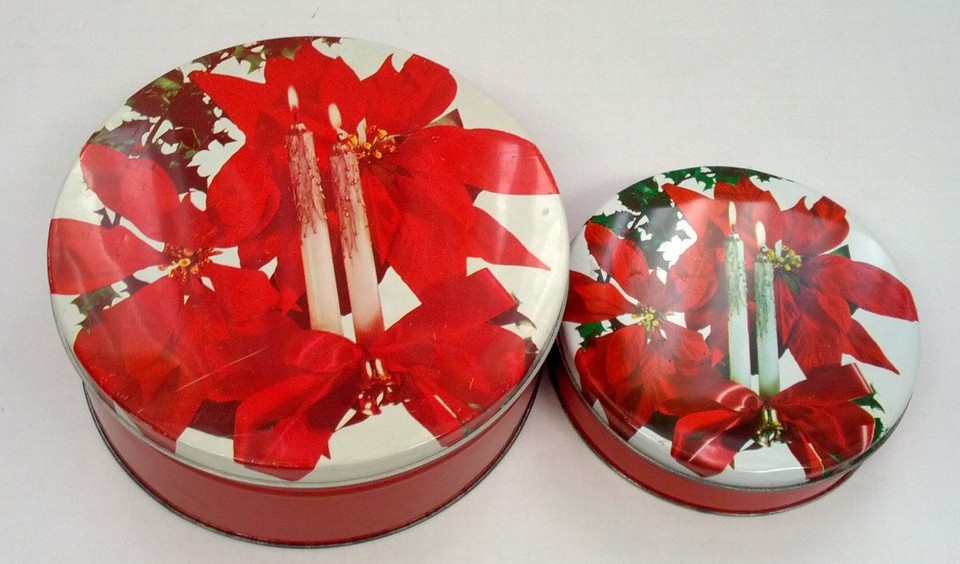 - Vintage round tin cookie candy containers poinsettia candle holiday design