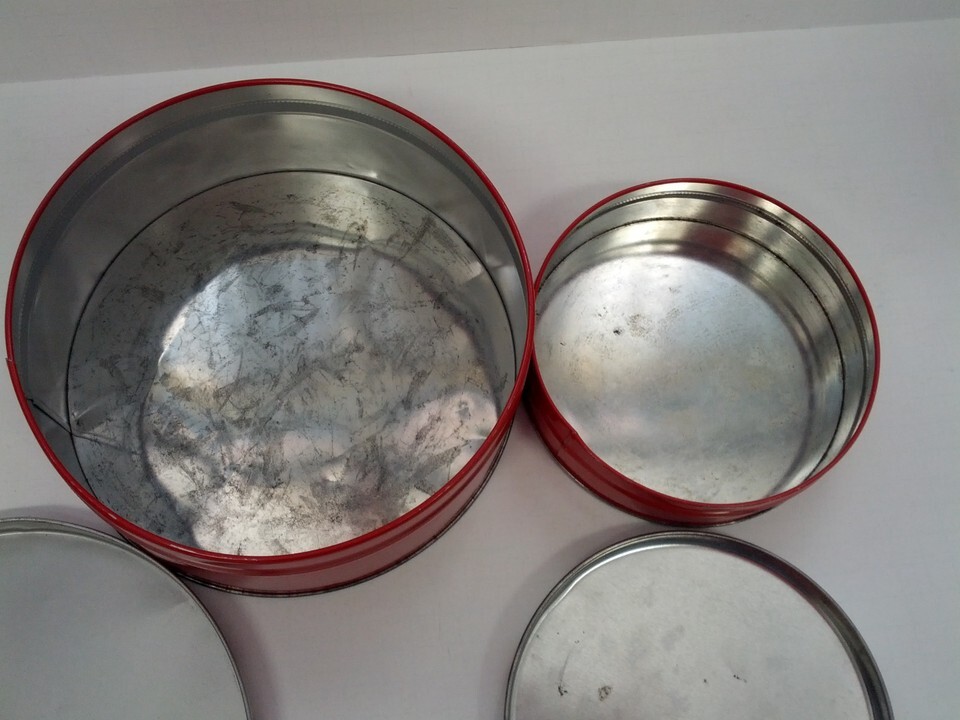 Vintage round tin cookie candy containers poinsettia candle holiday design
