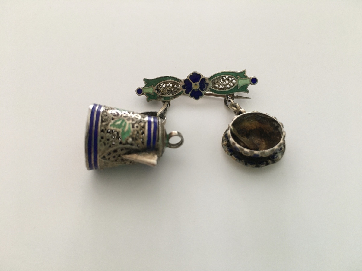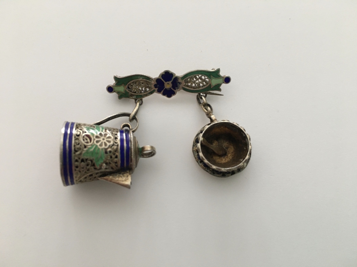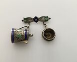 - Vintage sterling Topazio filigree enamel brooch mini coffee pot, cup & saucer