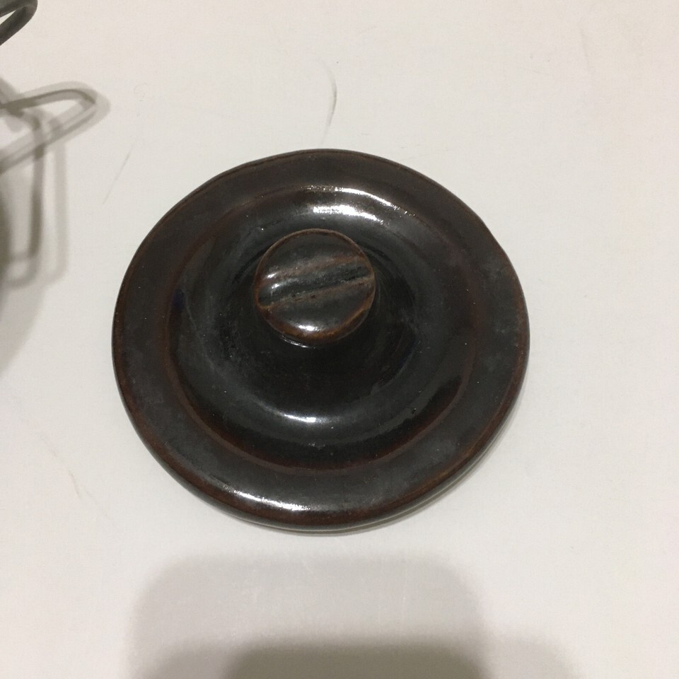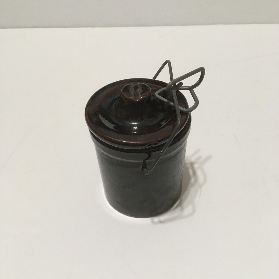 - Vintage stoneware small brown crock cheese jar with wire bale lid country decor