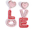 Featuring a border of white rhinestones, baby pink seed beads are embellished along a red felt heart frame giving way to red and baby pink seed bead bordered letters that spell out the word "LOVE." An additional row of white rhinestones is embellished along the center of each letter for a heartfelt glitzy finish. Earring attaches to a standard post fitting.